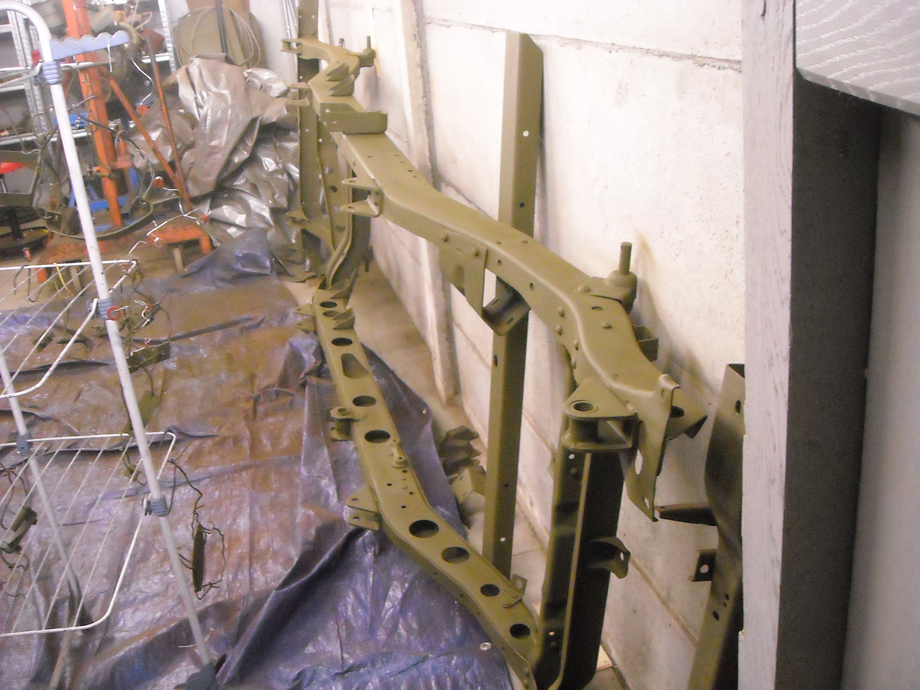 The chassis, painted in red oxide primer
