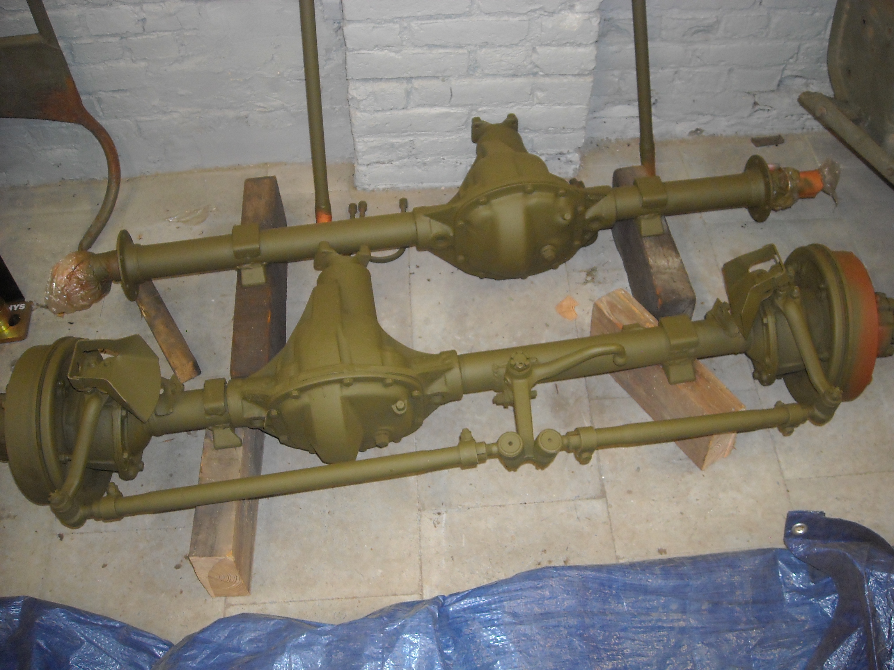 The front and rear axle, painted in red primer
