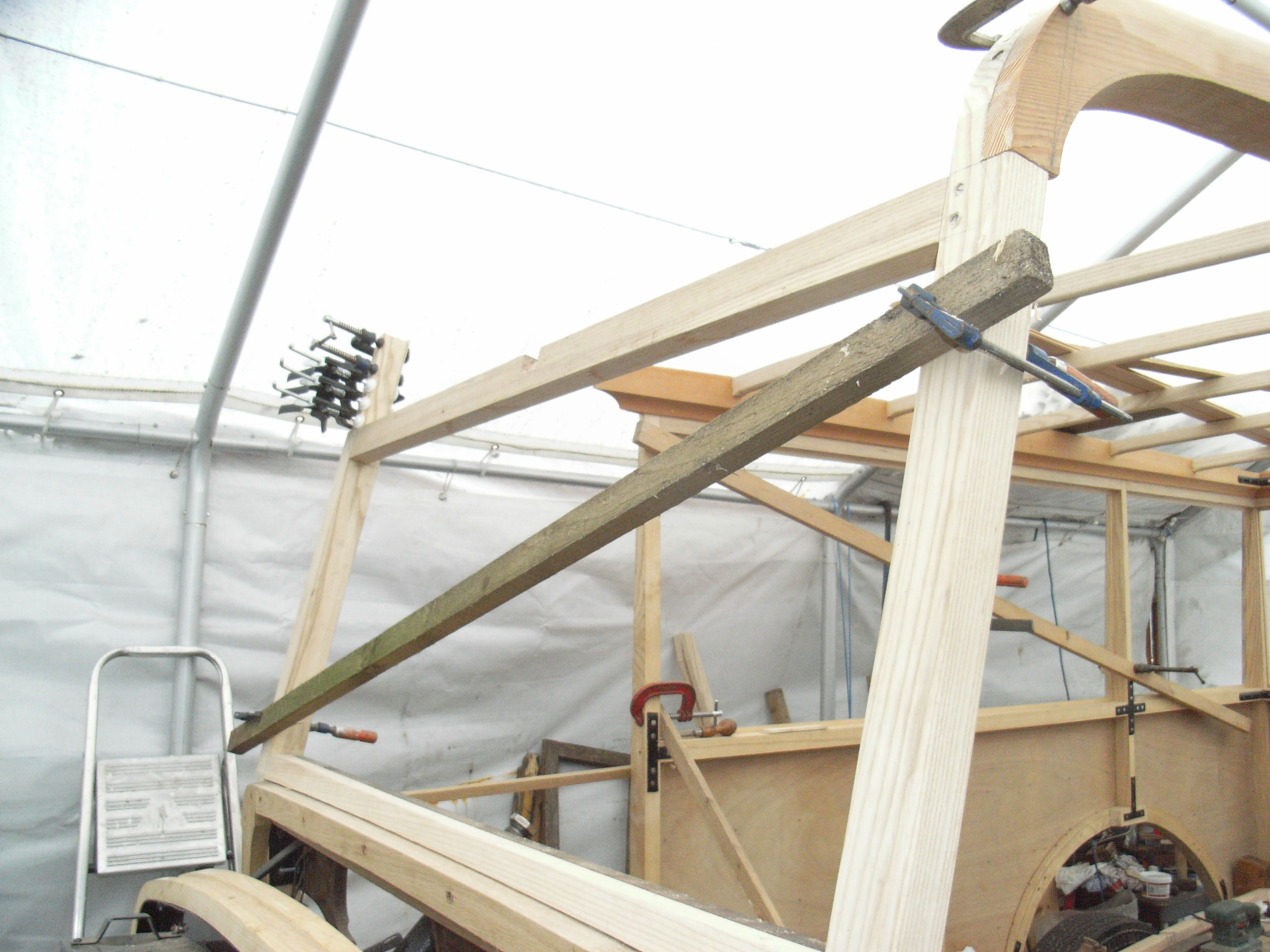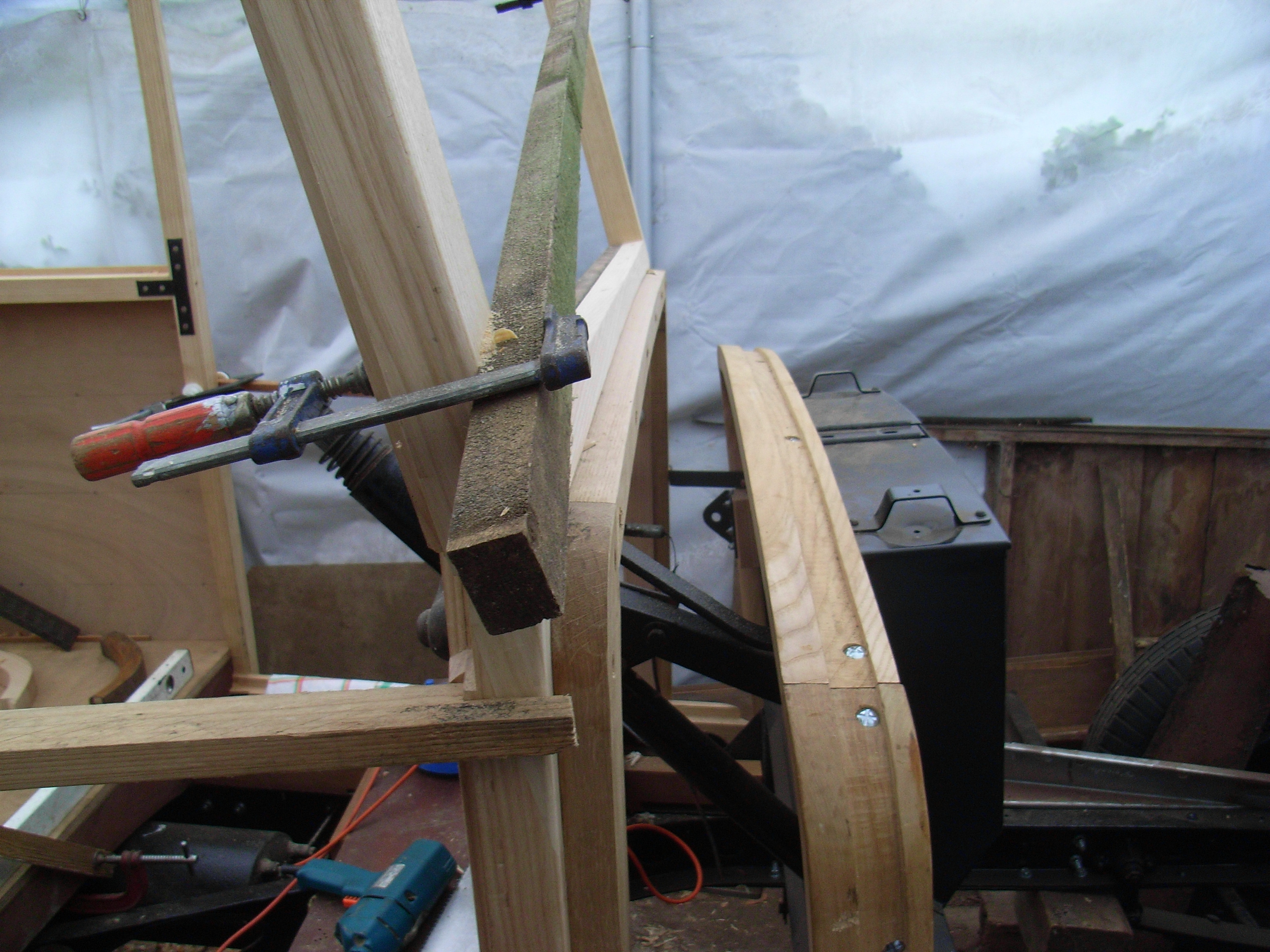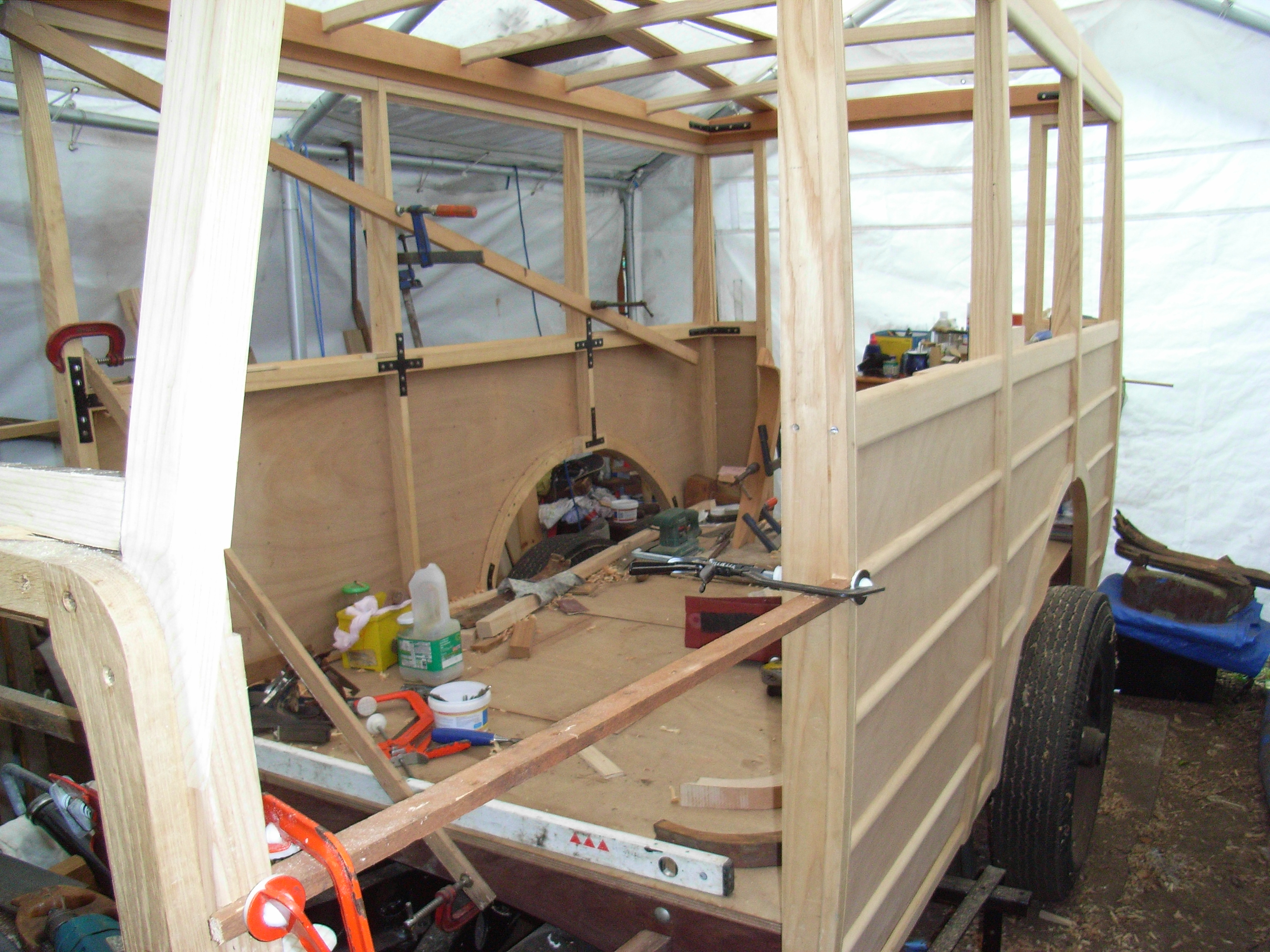 During the period when the rolling chassis was away Peter started forming and shaping the wood profiles, cutting in the floor members and trimming blanks to use to form the body.