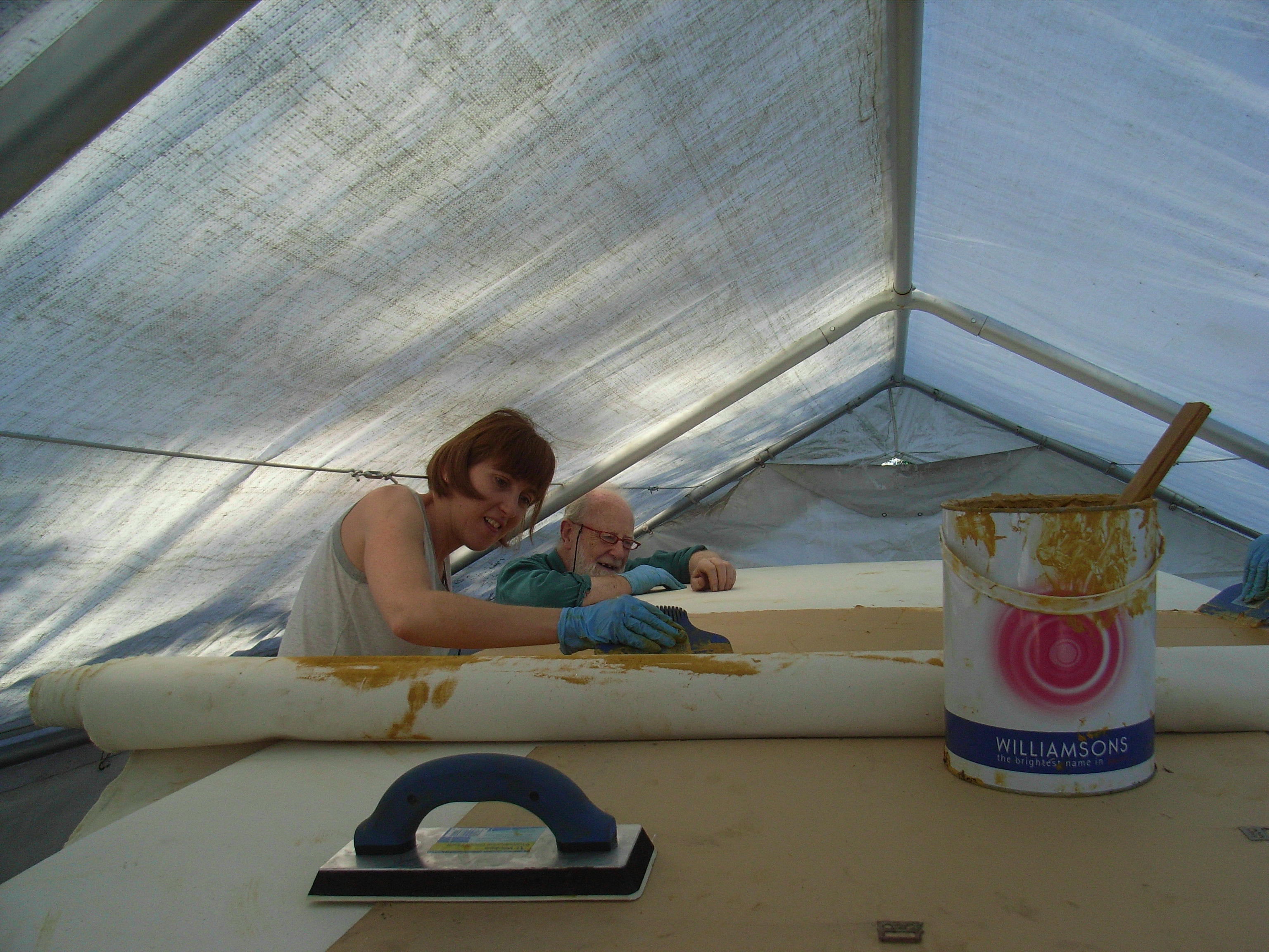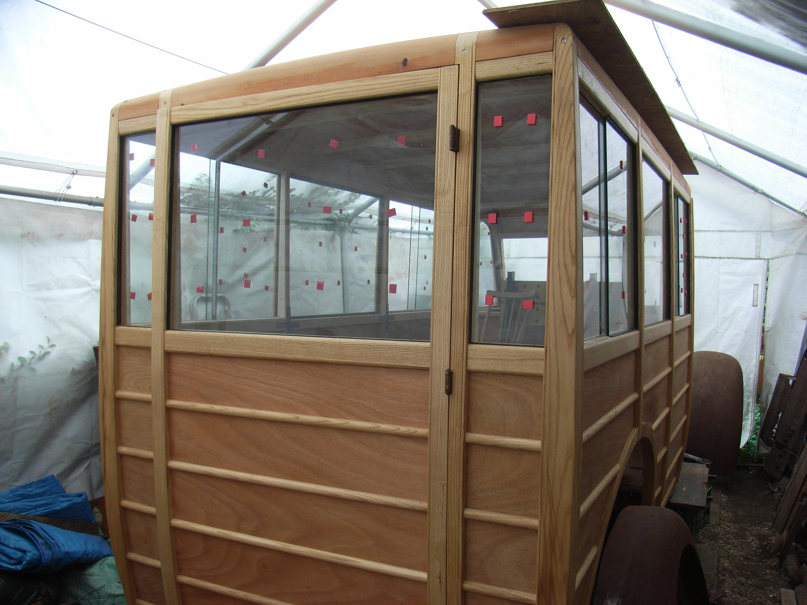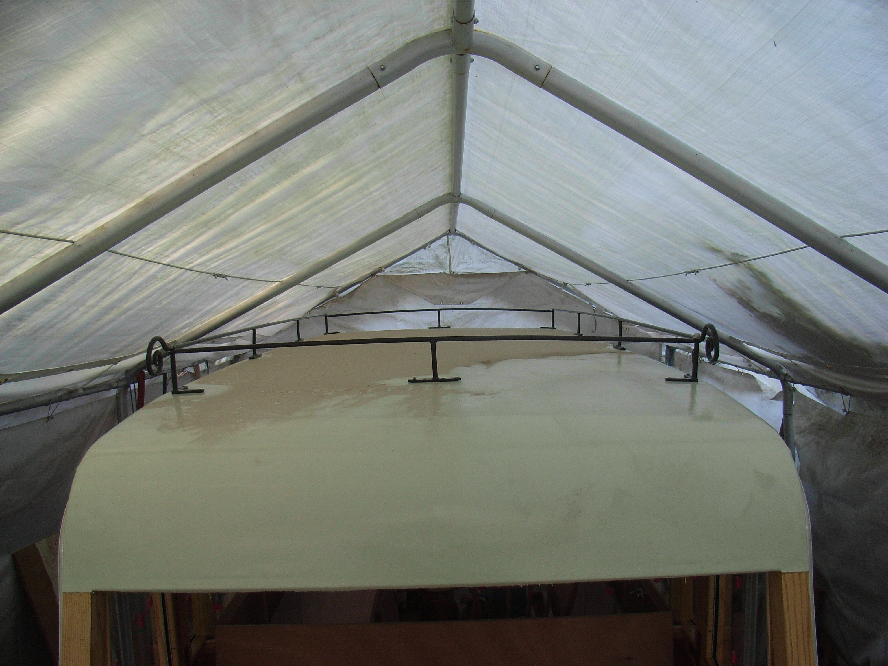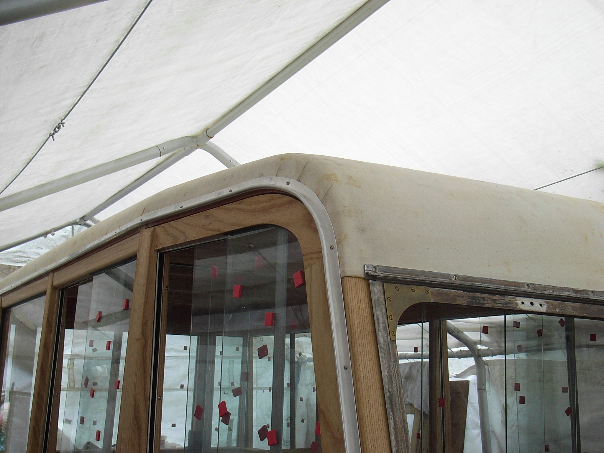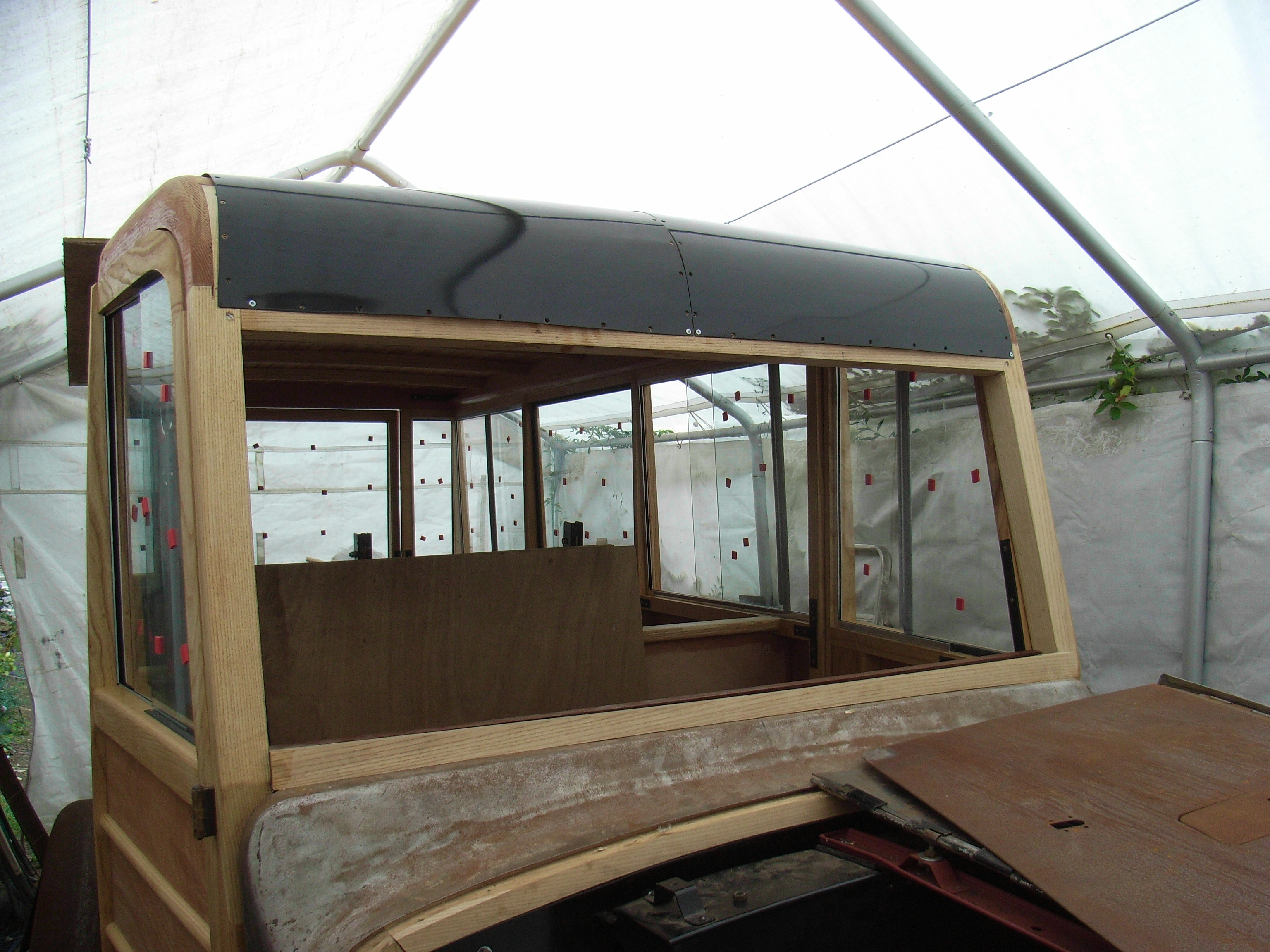 A couple of weeks back we covered the roof with two layers of very heavy canvass and stuck it down. Its the same method as and materials were supplied by; those who do train carriages. When i say stuck i mean not glued because it needs to flex and frett so the gloop is linseed oil with chalk mixed into it. I have no idea about this or the long term survival of it.