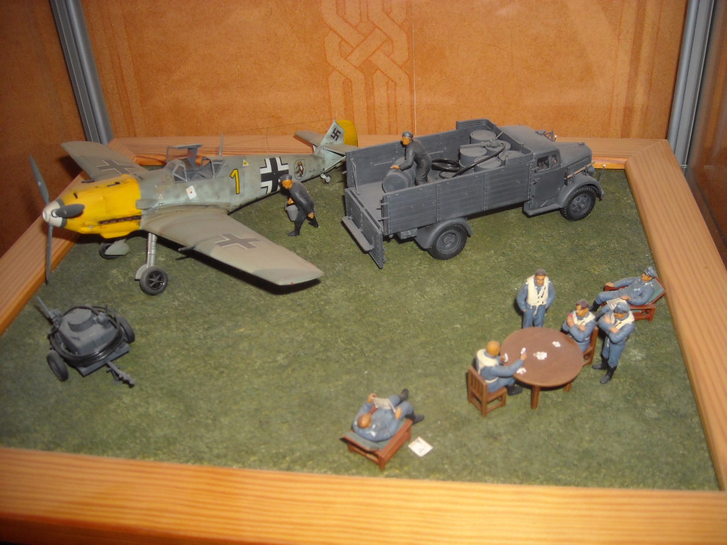 A small scene depicting Jerry pilots playing cards while the Bf 109 E is serviced somewhere on an airfield in France