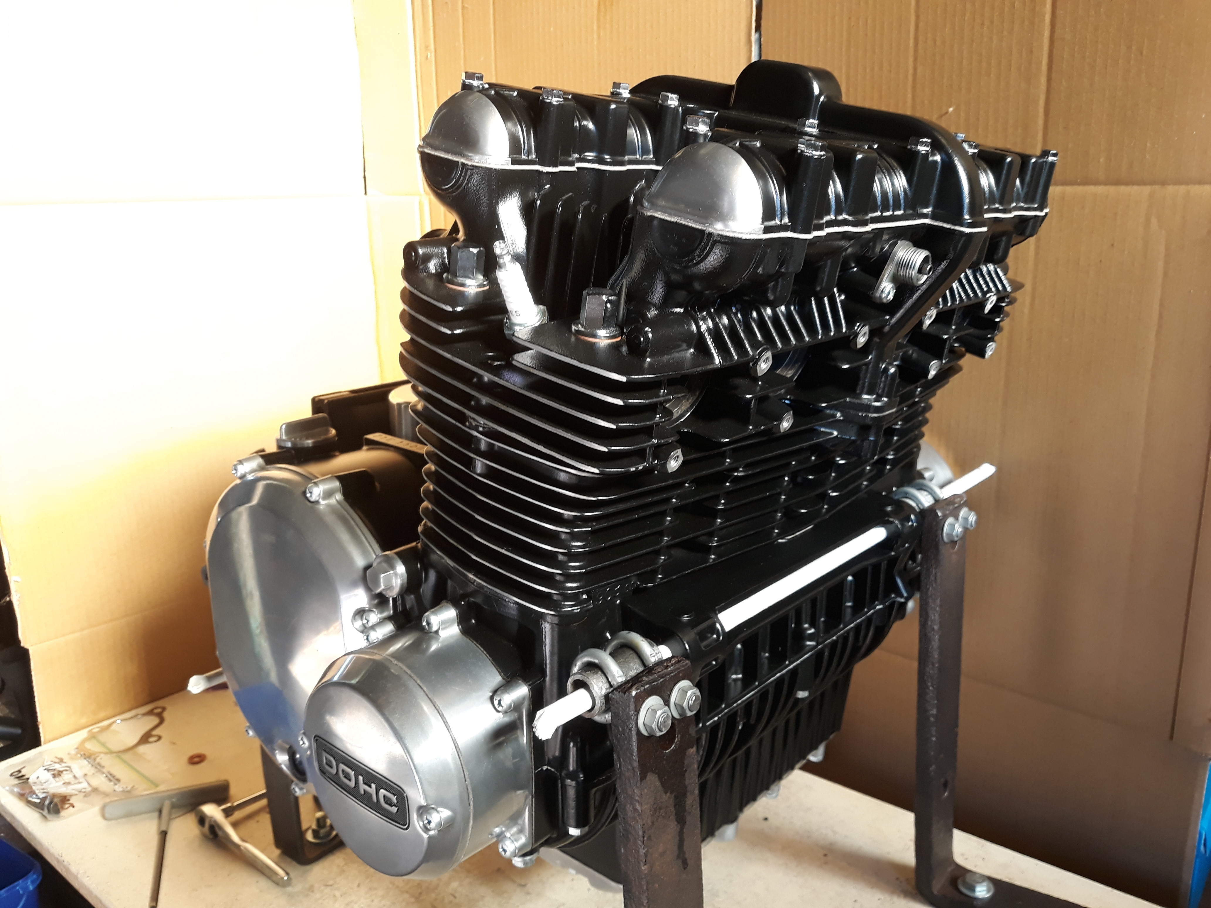 FINALLY have the engine repainted with Eastwood and reassembled. Pic during reassembly - area around primary drive shaft is original factory finish as this area was masked off during blasting and repainting. And final reassembled engine. Pretty happy with the outcome.