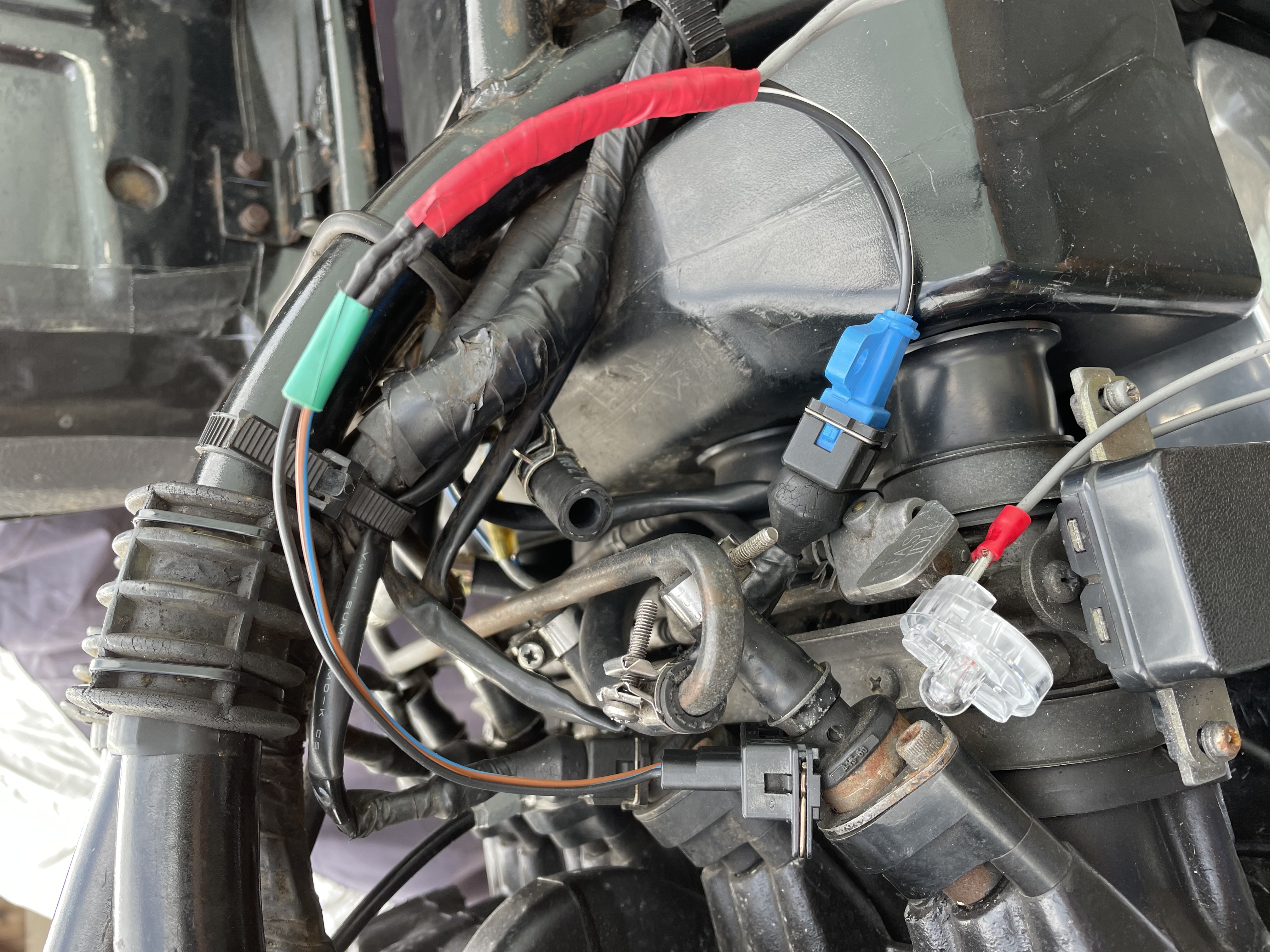 I'm still chasing an issue on my 'H' where it randomly cuts out when warm. I've fitted a break-out harness in the no.1 injector feed and a 'NOID' lite (non-operating injector detection...?) Worth its weight in gold! When bike is running ok, light flickers dimly in time with injector pulsing - all good. When the bike cuts out, the light is permanently illuminated and fuel is happily pouring into the engine as long as the pump's running (see pic of lite 'on'). After a cooling down period bike starts and runs ok for a while until it fails again. Something is breaking down in the ECU and permanently grounding the injectors.
