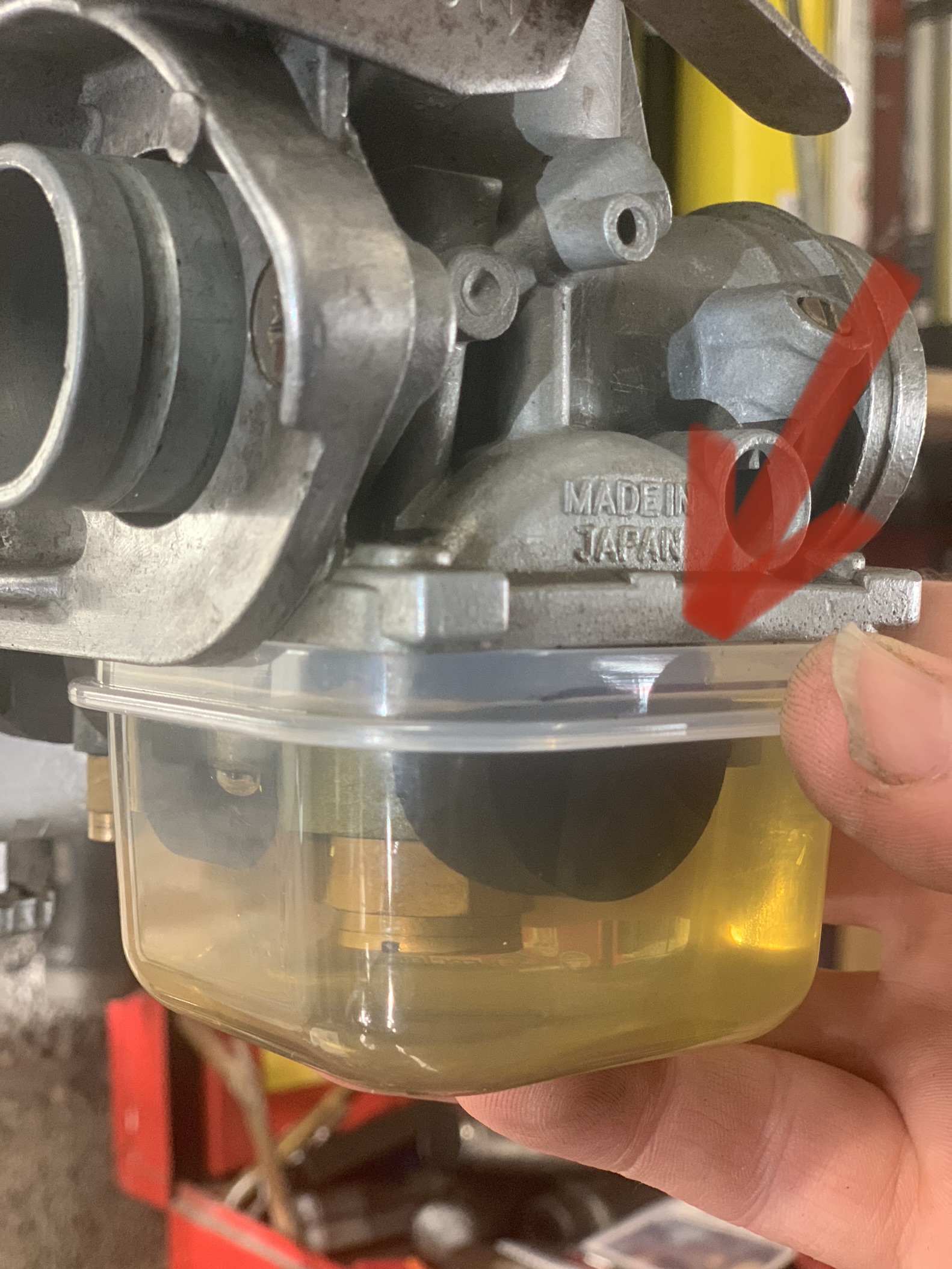 Hold a clear plastic food container of a similar size to the carb body and turn on the fuel.