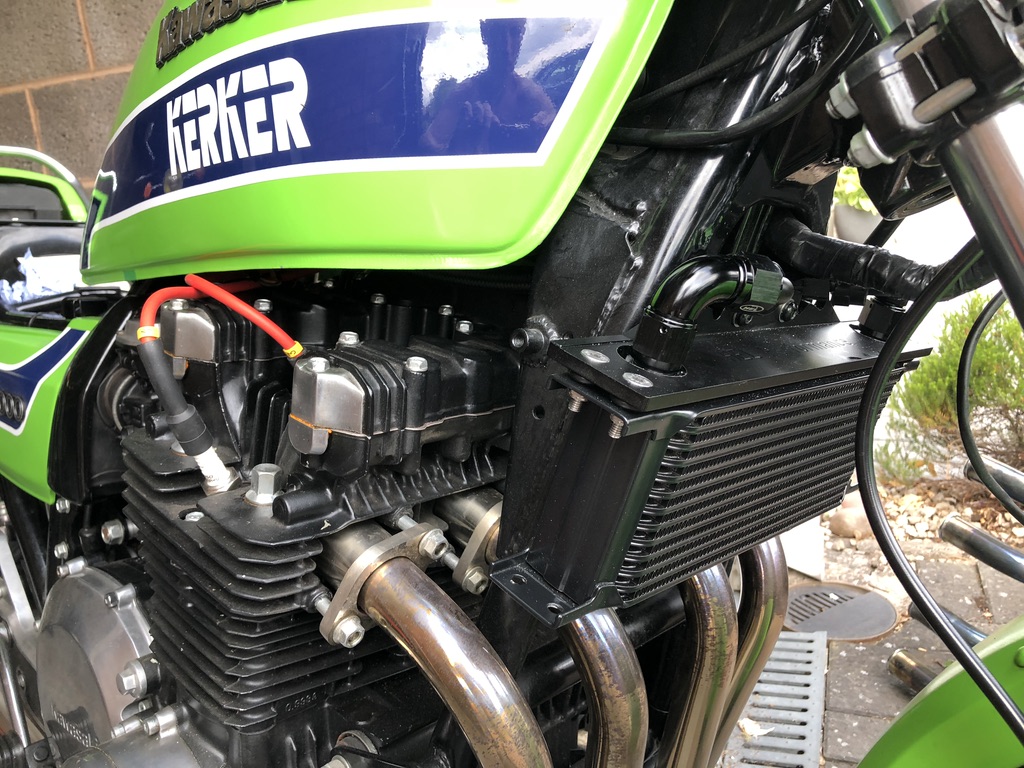 So, I re-routed the hoses to run under the tank and adapted the bracket holding the radiator to allow more space through the front of the frame triangle.... only to find that the hoses were then not quite long enough to bolt onto the radiator without being in tension and with some sharp bends :x