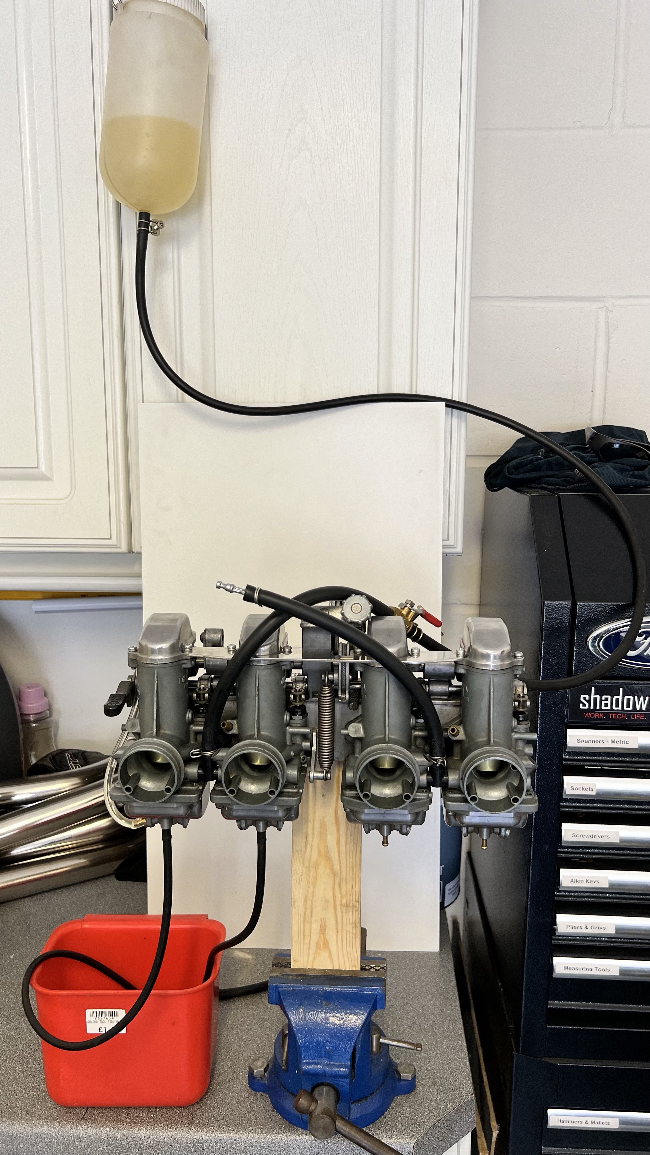 I didn’t get the chance to actually attempt to set the fuel levels, but I did manage to get myself all set up ready with the carbs bolted to a spare piece of lumber and clamped upright in the vice, and being fed from an auxiliary tank as you’d expect.