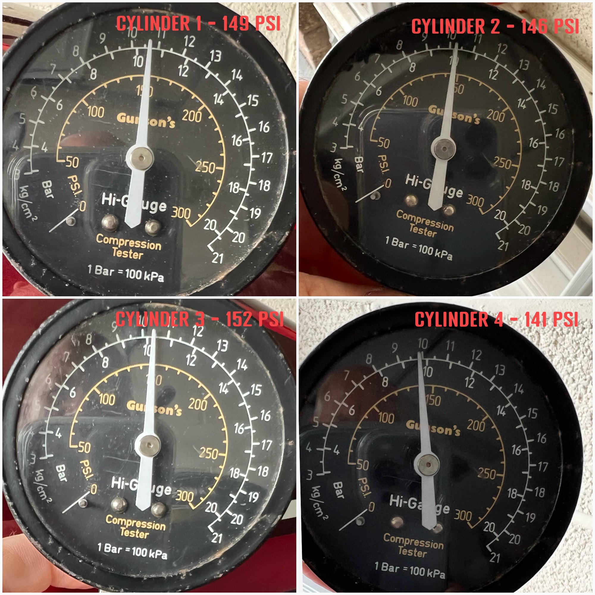 For completeness, these were the compression readings I got with a cold engine, full open throttle and about 6 kicks on the kickstarter