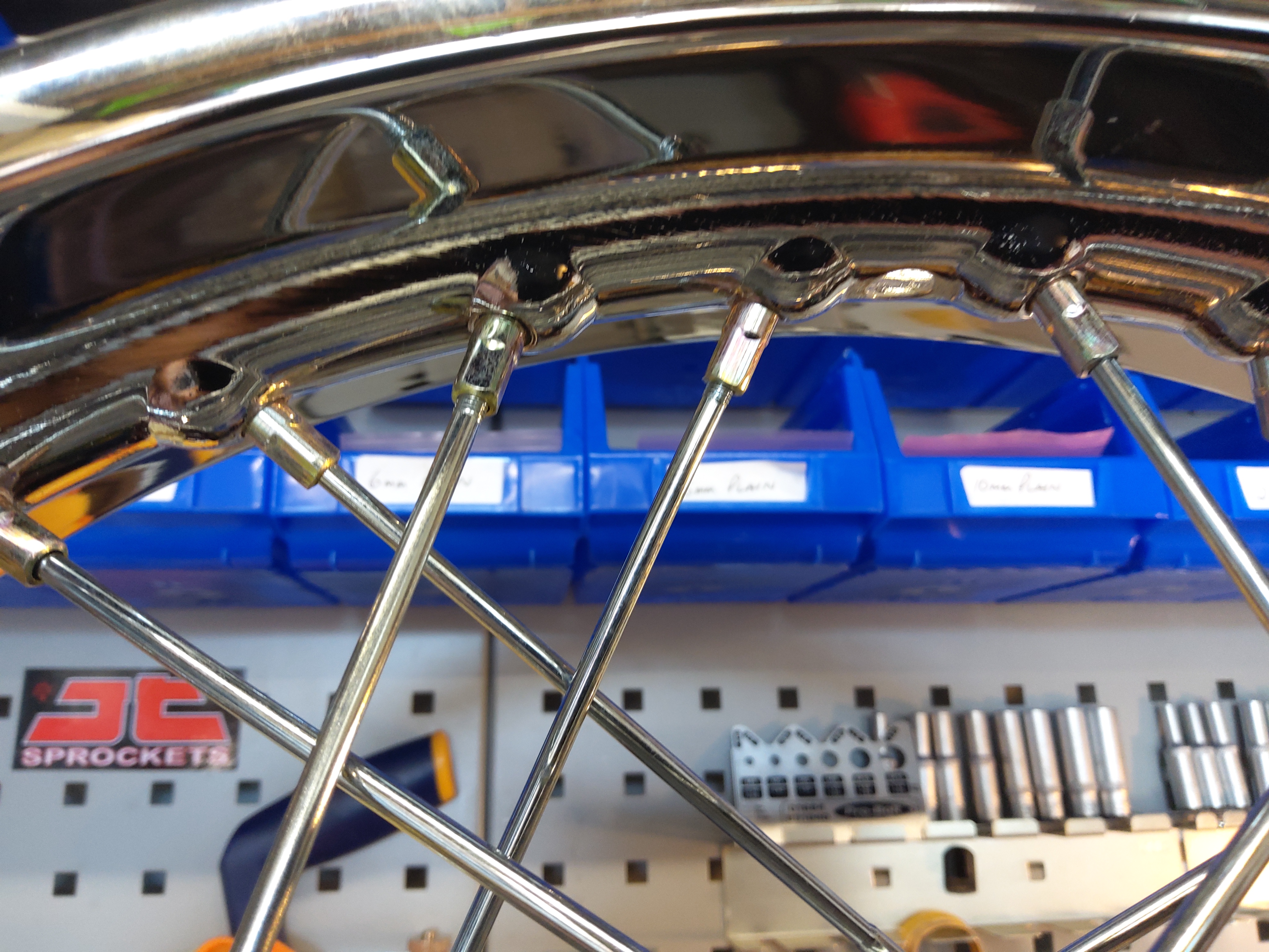 the correct way to install a tyre gripper is first the protective rubber band, the tire gripper through the rubber band and the rim, a spring washer and a 8mm nut. You can always put a plain washer between the rim and the spring washer in order to protect the chrome but that's up to you.
