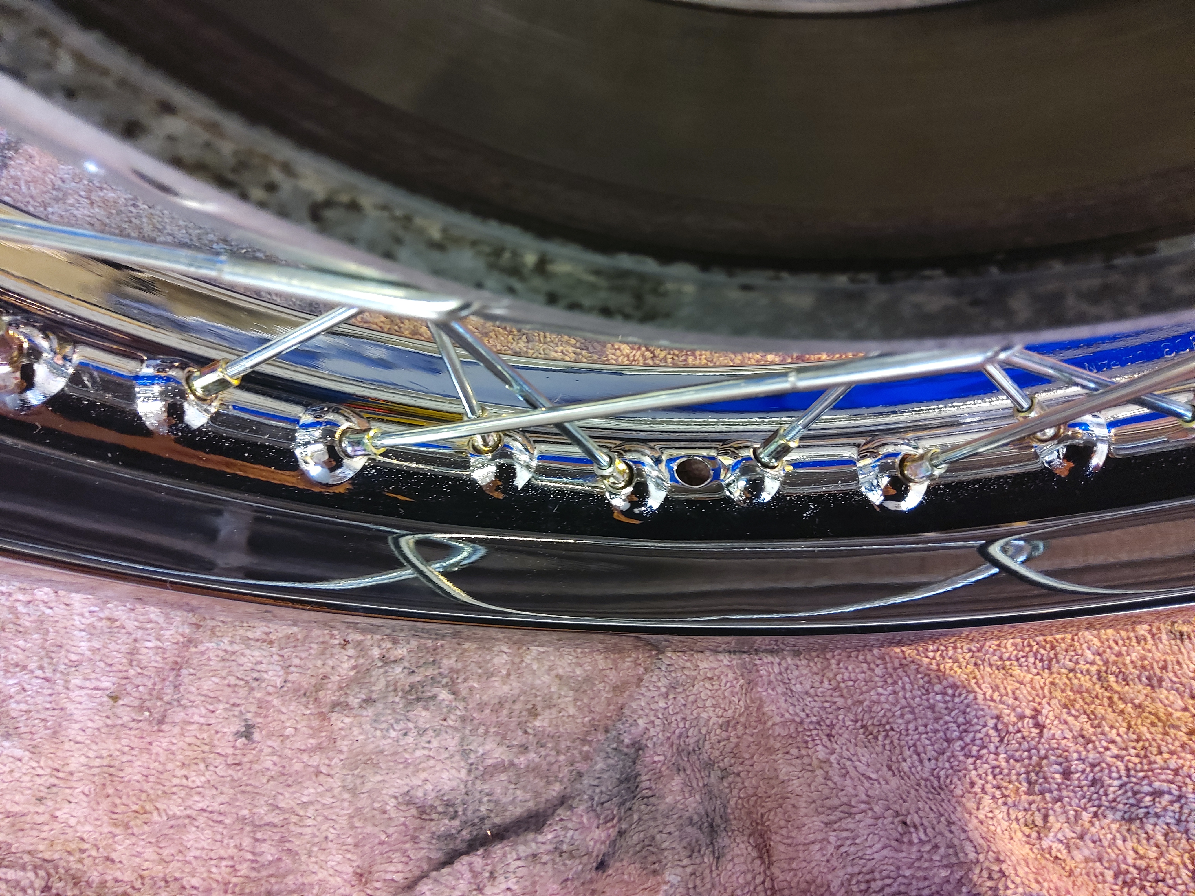 Further to my previous post of today, herewith the rear wheel lacing. Any advice regarding errors in the pattern would be much appreciated. I started with the hub near enough centred in the rim, with the stampings side down, the valve hole at 12 o'clock and the hub shoe side up. I then inserted the first top inner into the hole on the right side of the valve and rotated the hub clockwise until it was again centred. Then I did the 2-4 process on the inners, and turned over and did the inners on the other side. I'm hoping that's the correct procedure. Interestingly, and something I hadn't noticed before is that the rear rim has two valve holes! Can anyone confirm whether this is normal?