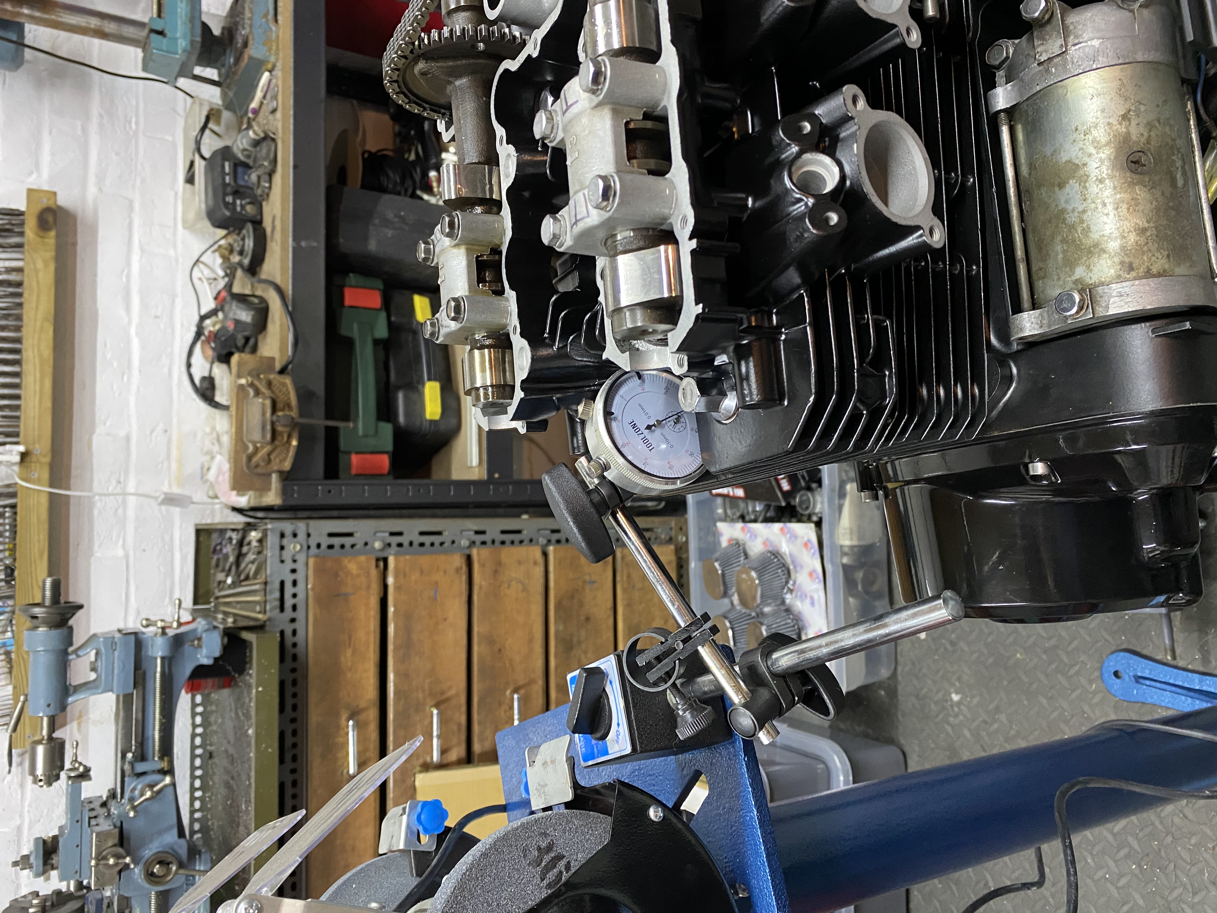 The inlet timing at 44 t back from this will be correct in relation to the exhaust but not in the correct position until the cam cover has been fitted as this pushes the chain down and pulls the inlet sprocket clockwise.