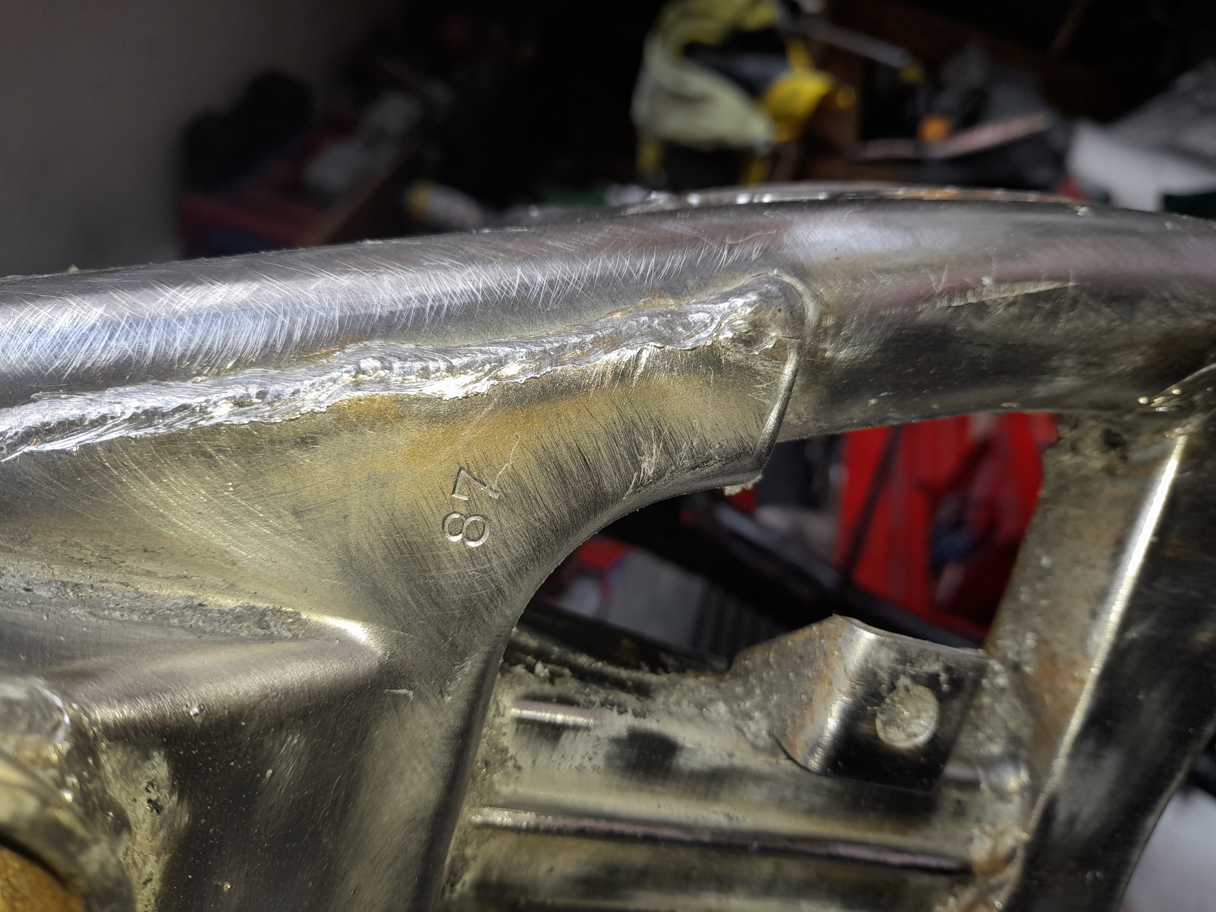 If it has the original swingarm in it, does it have any damage immediately behind where the front sprocket is? It would be on the cross tube on LHS if it does!