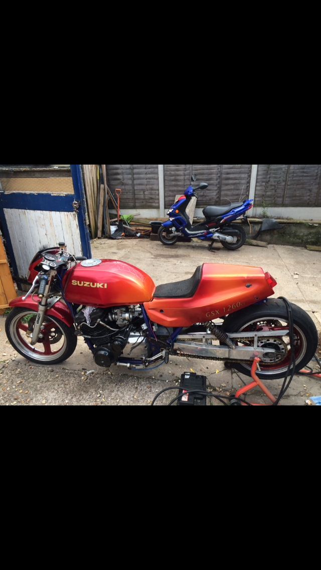 Gsx 1216 efe turbo 16 psi welded crank forged Pistons lock up clutch radial front end built by me from a frame and tank turbo pipes welded by my mate in a shed.