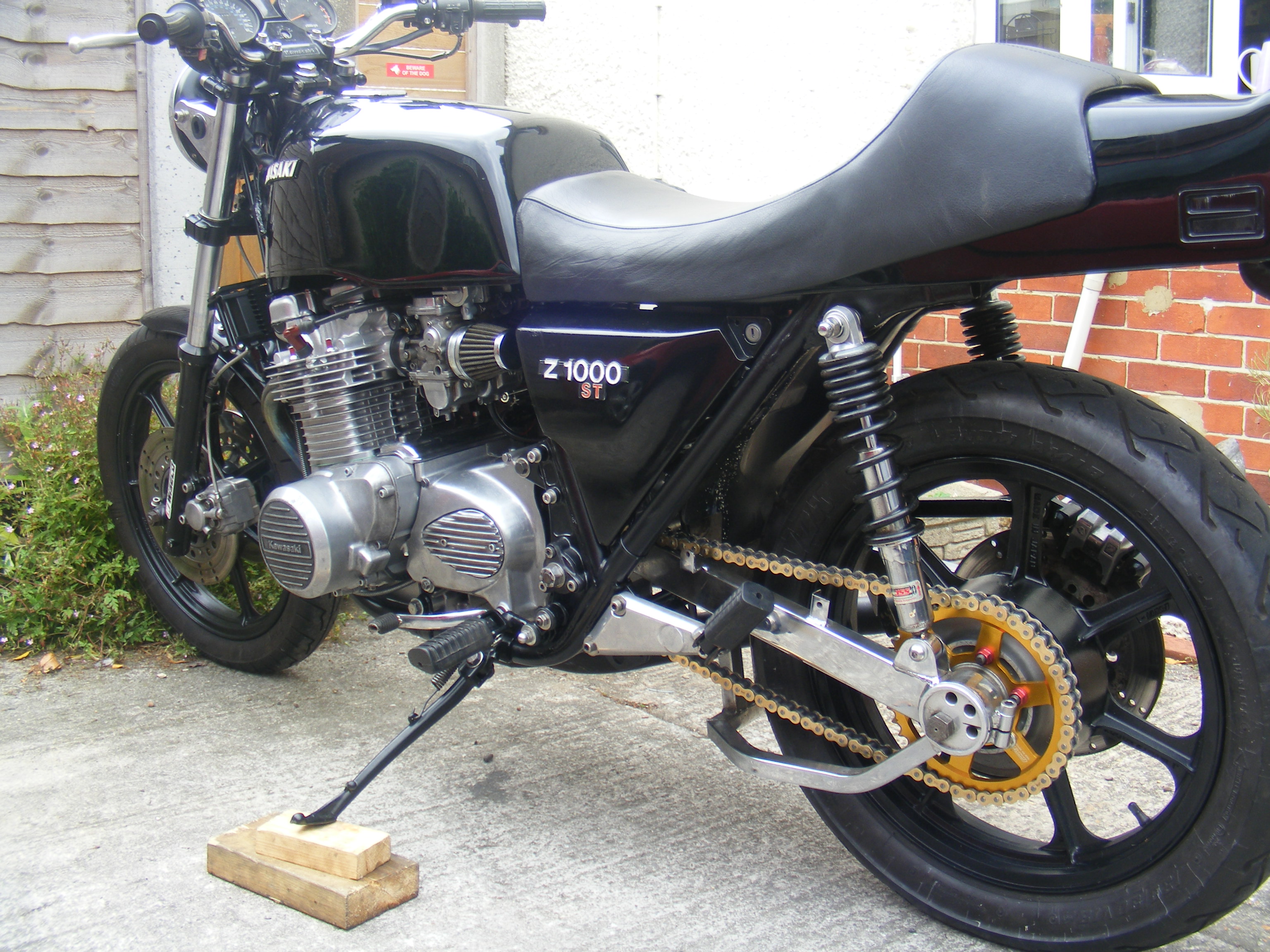 A few pics of bike to date ,taken this afternoon after a short ride round town ,have had a few teething problems since getting it running a few weeks back ,the gear change jammed once the engine was hot ,transpired the pin on the lever arm was catching on the inside of the sprocket casing ,this was in part due to me having to shorten the arm down to work at all ,resolved the issue by shaving a bit off the inside of the casing and also to be safe I doubled up on the gaskets to give extra clearance ,since then it has been fine,all in all I happy with the final result ,I don't know why I had a bee in my bonnet about converting a shaft to chain ,used to have an xs750 years ago and also thought that would look great as a chain drive bike!,from a financial point of few its probably not worth converting a complete st unless you already have some bits lying around ,its surprising how it adds up if you factor in ,swinging arm ,disc ,rear caliper ,wheel etc etc ,however the actual engine side of things dosn't cost much tho it is hassle as Ive already tried to explain the ST selector drum isnt designed to run behind an inner chain sprocket ,mine only cost so much as I bit the bullet and had the crank checked while the bottom end was apart ( this was then reconditioned etc by Debbens as bearings were on their last legs!),also fitted new bearings on both shafts and did the cam chain so as I say it all adds up!,its now running nicely and rides well ,gear change actually seems smoother than before ,also its a lot easier to push it out of the shed now! cheers all Stan.