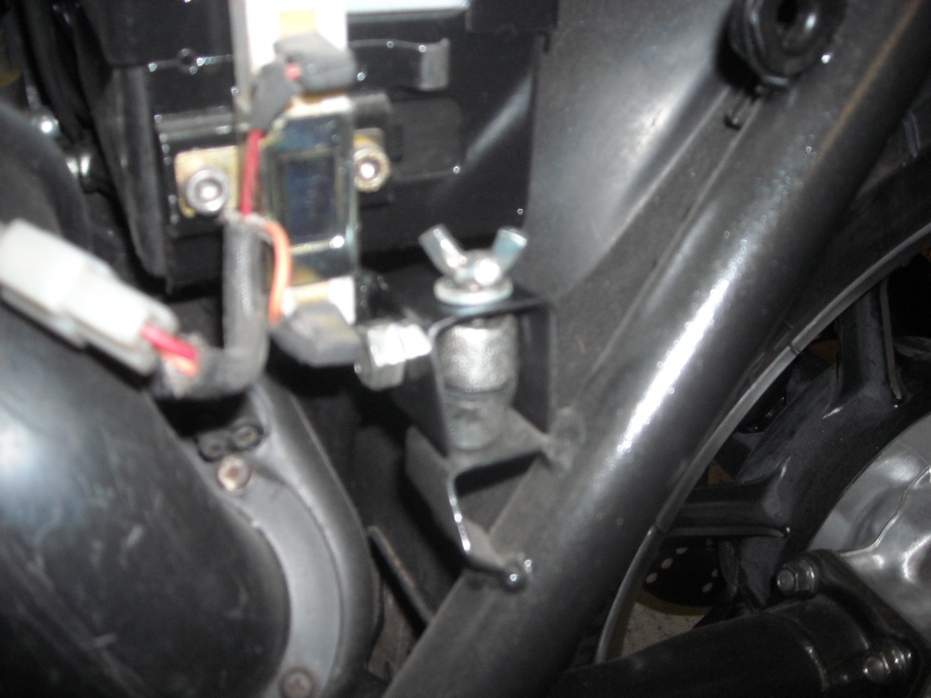 This is the place where the kickstarter of an ST belongs: under the air filter and battery box, attached to the frame by a U shaped bracket and a butterfly bolt.