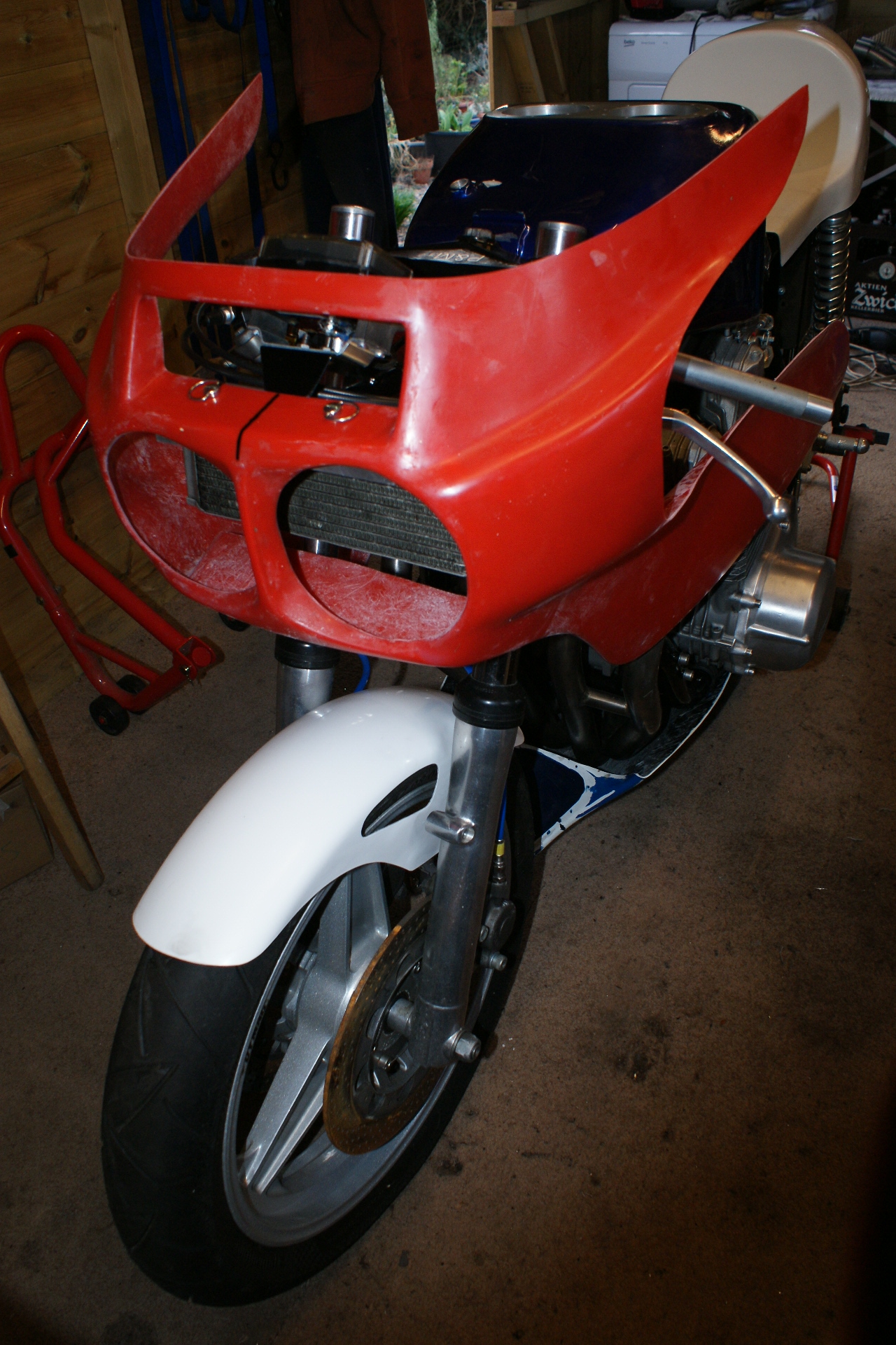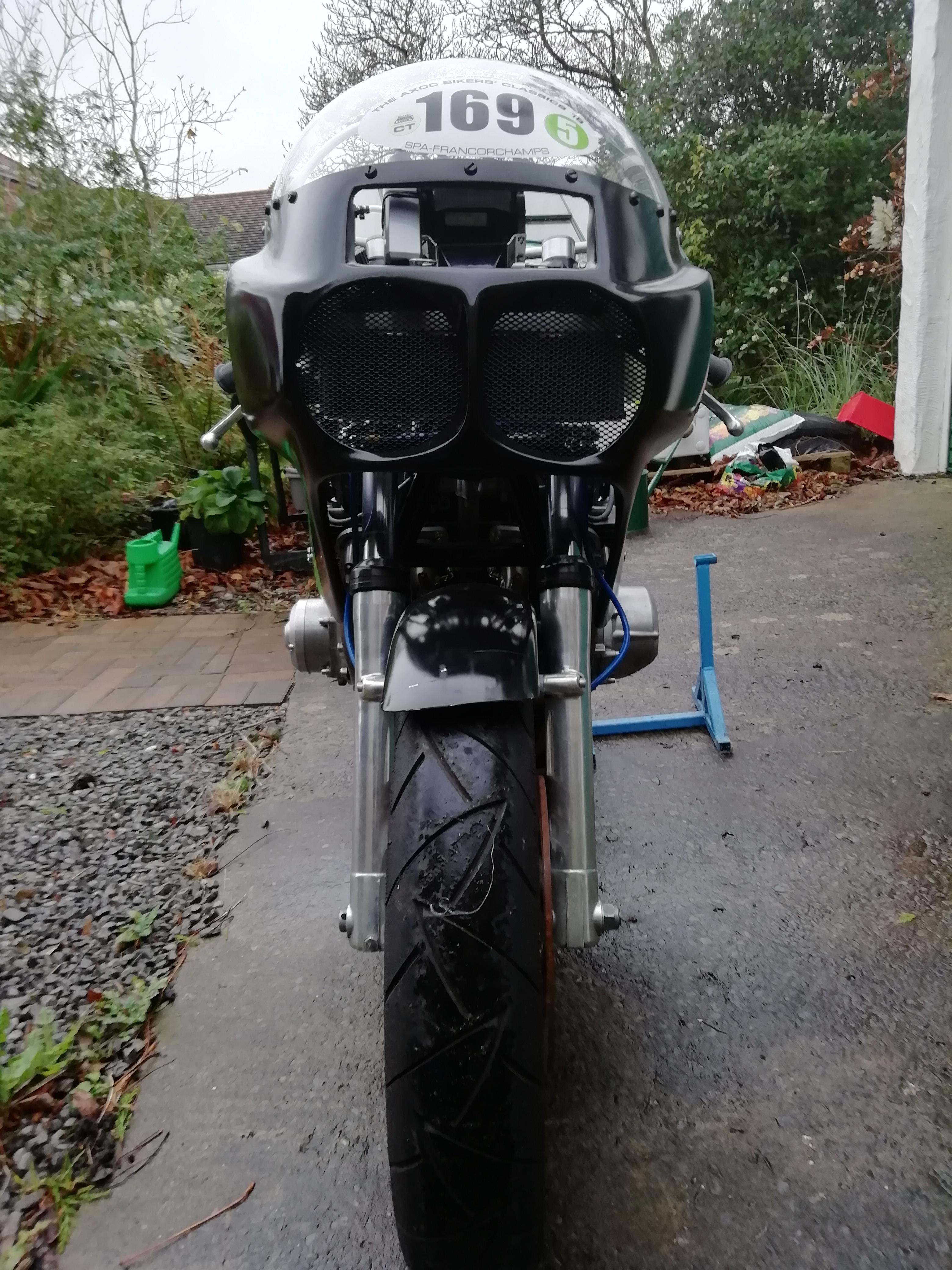 After trying to locate an endurance style belly pan that will actually fit the wide P&M frame and hold an engine full of oil and look the part i gave up and took the cutting disc to the "XR69" fairing that came with the bike: