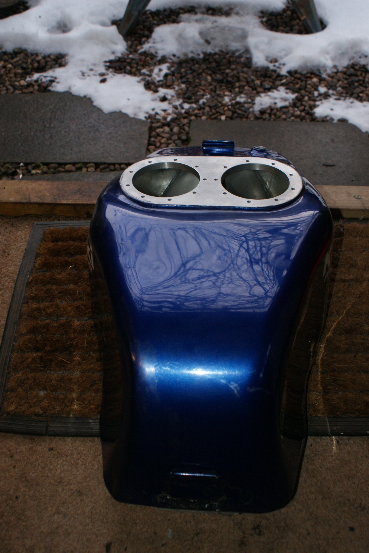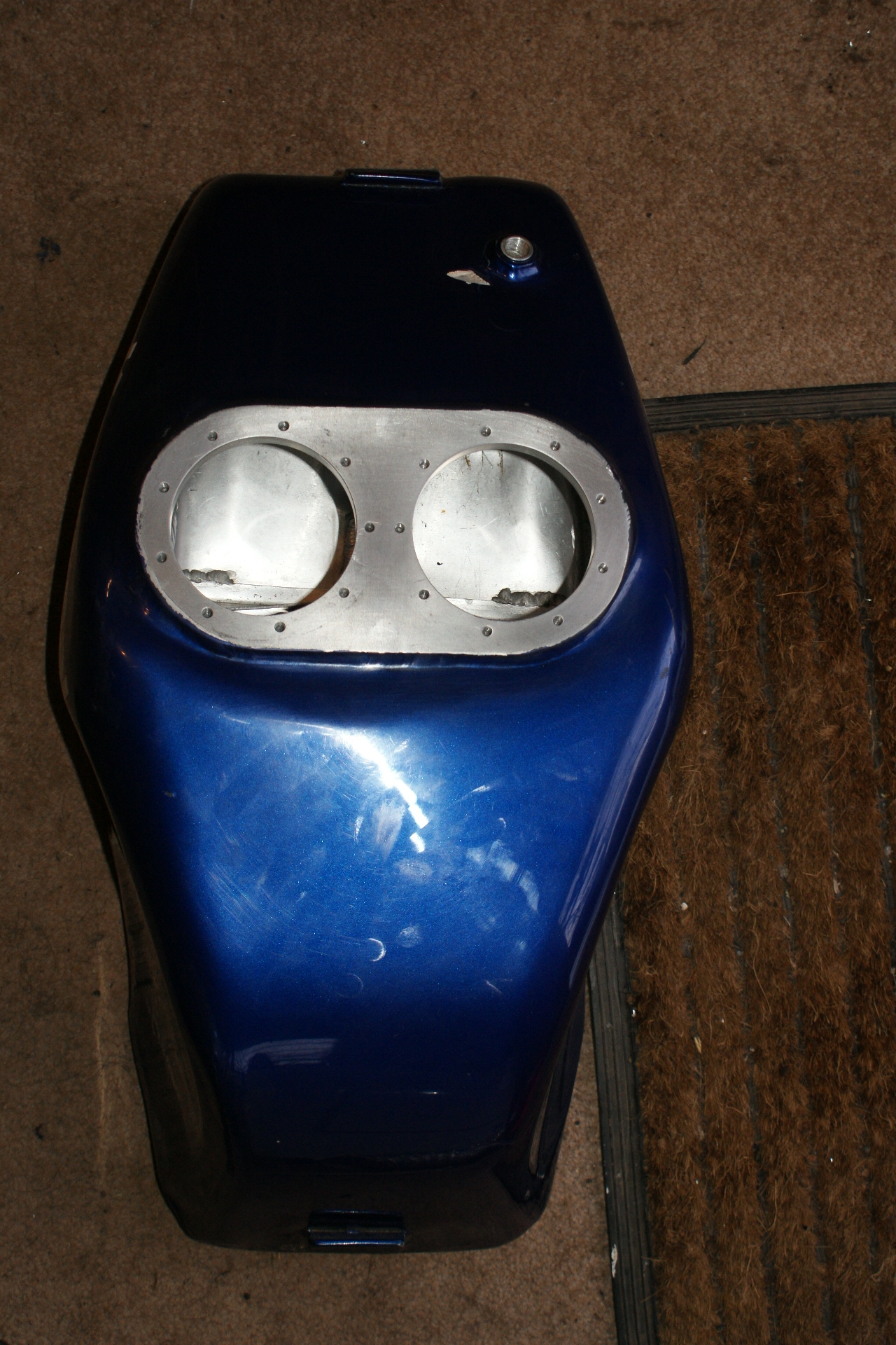 Spent a good hour or so pushing the dent out of the front top of the tank under the breather fitting. End result, dent partially pushed out, found out it was already bogged as well as witnessed by the cracked filler next to the breather. Now need to leak test it somehow?