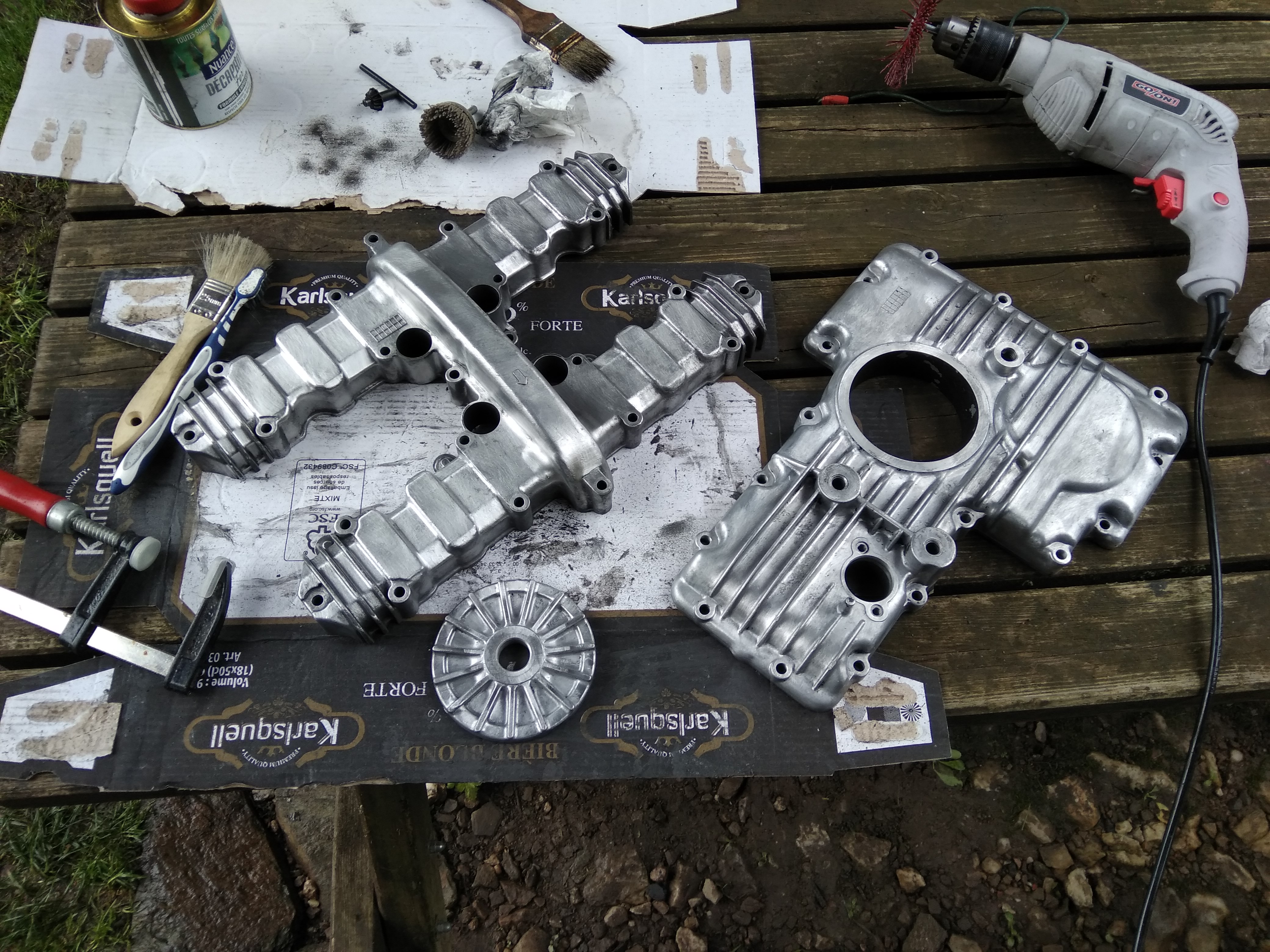 The sump pan almost did itself, stripper applied, wait, jet wash, repeat twice more in the places the paint hadn't lifted, bit of a scrub, done. I'm hoping the engine casings go the same way..