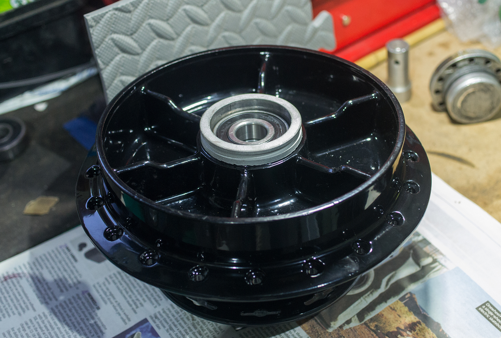 Anyway, the hubs were blasted and powder coated down at RPA in Bristol along with the frame etc, then I fitted new bearings. The original rear one had the inner spacer missing so a mate made me one out of ally, and I had an ally one made for the front hub too. Then I looked at what size wheels to go for. My Hinckley Bonneville has a 19" front and a 17" rear and I could see that there's a lot more choice of rear tyres in 17" compared to 18 so I mocked up the chassis with the original rear wheel and then the Bonnie one to see what it was like - bearing in mind that the rear end is jacked up slightly because of the different (Bandit) swingarm. I don't want it jacked right up like I see some, even if I'm tall enough to still ride those. Photos:
