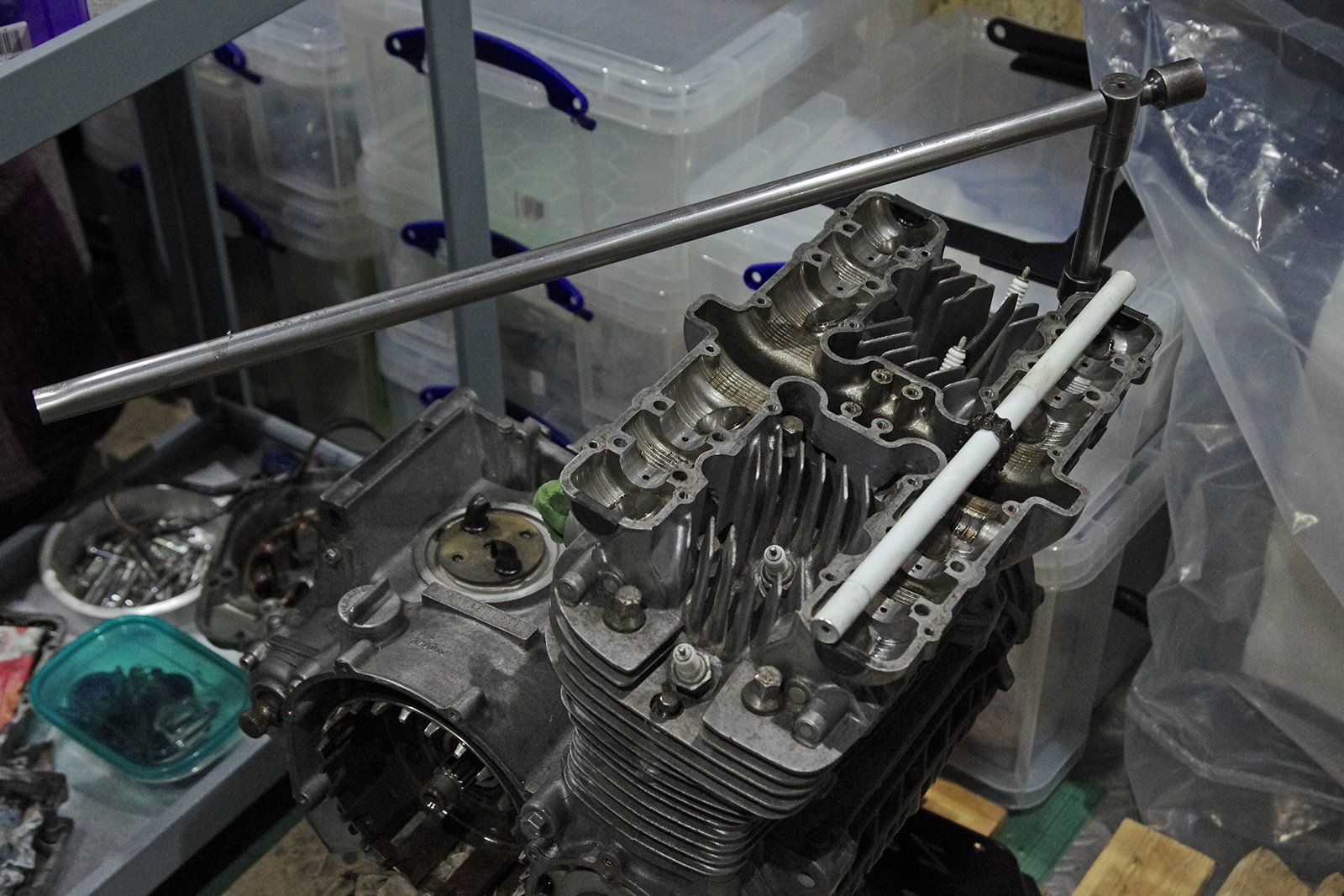 Well. When I bought this collection of parts I tried as best I could to examine the engine and I couldn't see any damage except for scrapes and so on - the generator cover had a crack in it too - and I was particularly careful to check the exhaust studs. They had all been removed and all the threads are good, so that was OK. Once I'd got the bike home I sat the engine in the corner of the garage on a pallet and basically ignored it for ages. Then when it was time to start on it I took the cam cover off and checked the clearances - all OK, a couple a tiny bit tight, but fine, and I drizzled some oil over the cams because I wanted to do a compression test. The starter motor had already been removed and as I was putting it back on I noticed that one of the lugs for the two M6 bolts that secure it was broken off... bugger. And worse, one of the M6 crankcase bolts in that area was also broken off, and difficult to get at to drill. Well if I'd known I would still have bought the bike but maybe I could have haggled the price down a bit... lesson learned, check more carefully before buying!