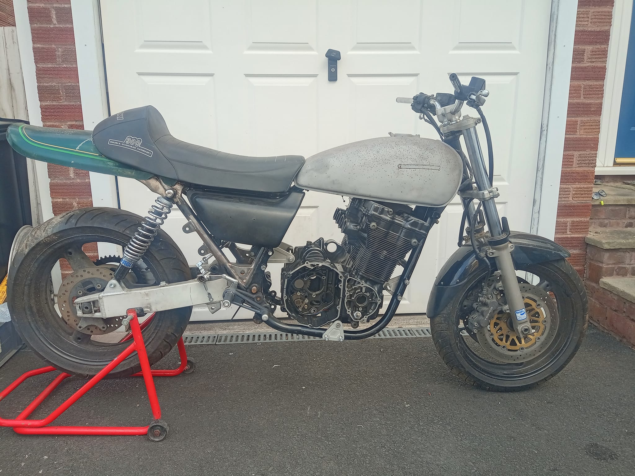 Using a set of empty cases in the frame to look at chain alignment and the stance I slotted a few parts together earlier. I have a late Bandit K6 (I think) front end for the forks etc will try the ZZR wheel . Billet yokes will be used to obtain a decent off set . Hope to have it rolling in a fashion in the next day or two .