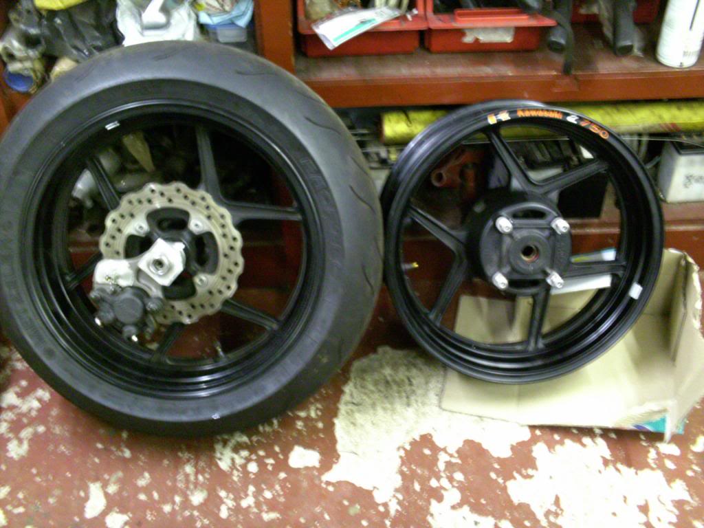 Finally sourced a matching 5.5 inch rim from a Z750 to replace the ZX10R's 6 inch which i used for the dry build and is too wide to get correct chain alignment whilst keeping the wheel central.