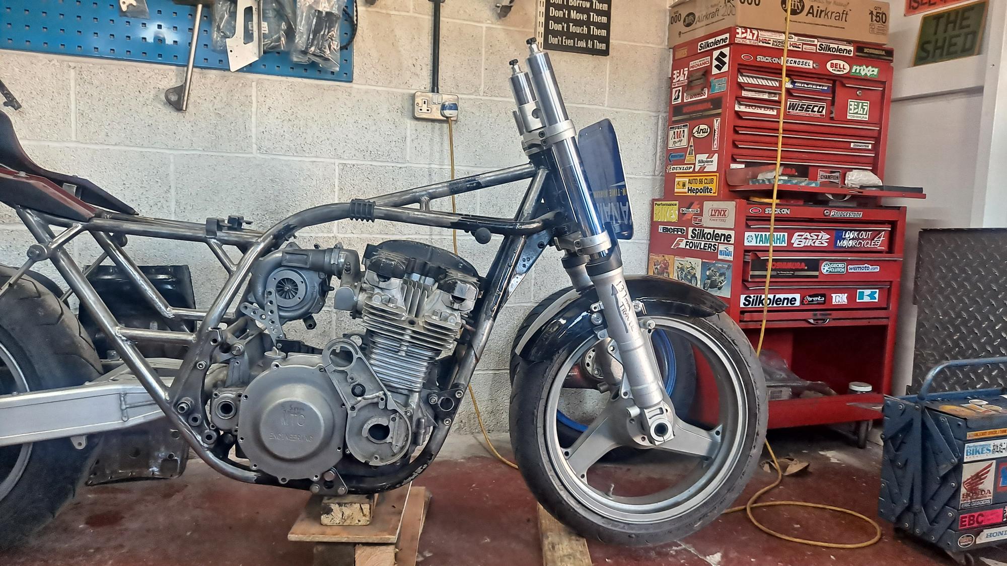 I want the pipe to take the shortest route to reduce lag as much as possible so i've dropped the FJR forks in the yokes by the maximum amount of their 137mm fork travel which shows me how much room above and behind the mudguard i have to work with.