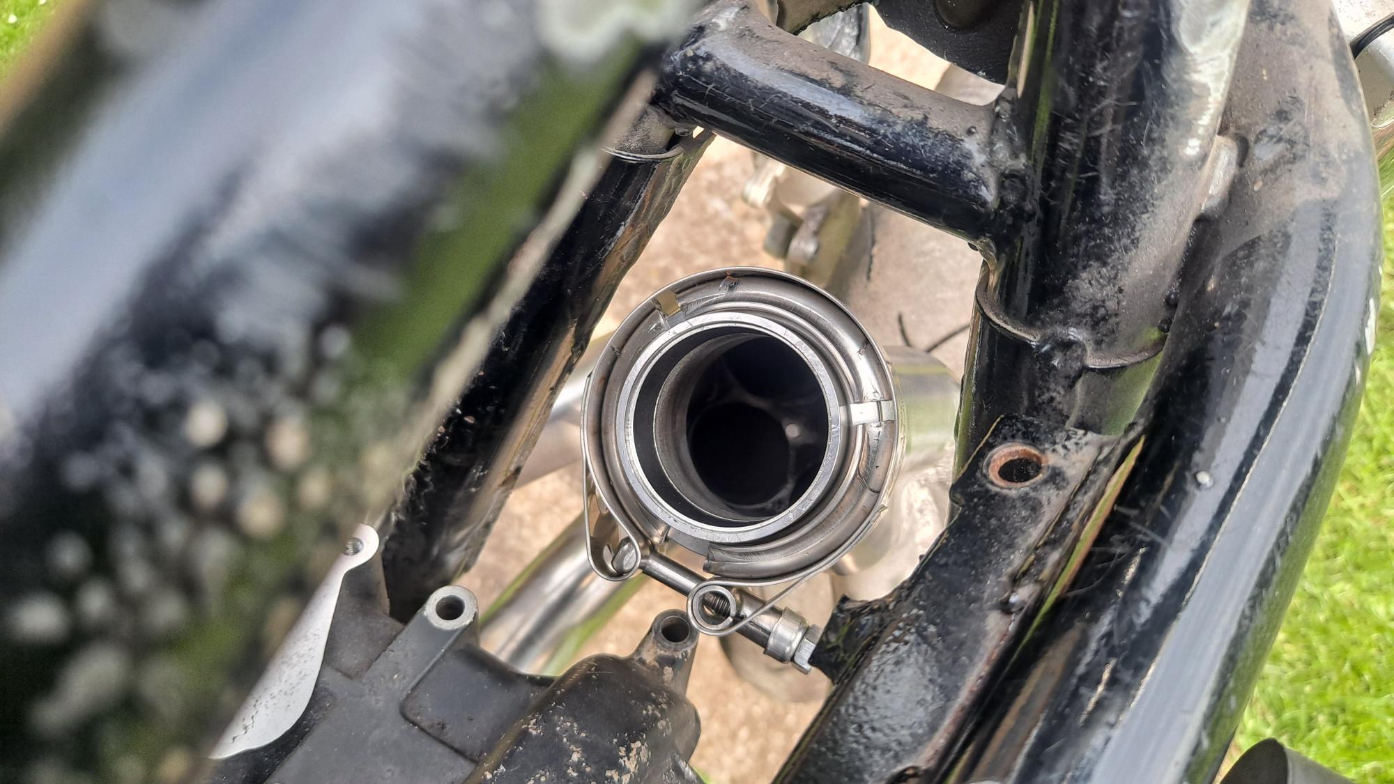 And the V band clamp ended up in the perfect spot with just enough clearance between the frame tubes to slip the retaining strap off.