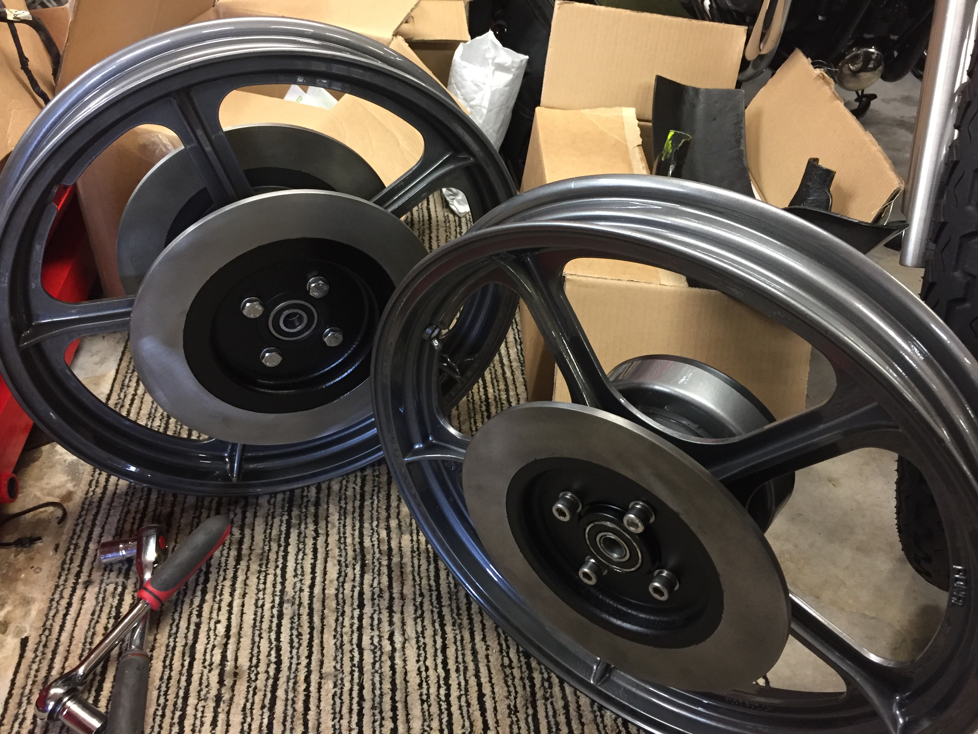 wheels done, coated and new bearings, cast discs cleaned and painted, those wheels weigh a ton with those discs - only needed 25g weight to balance with tyres on