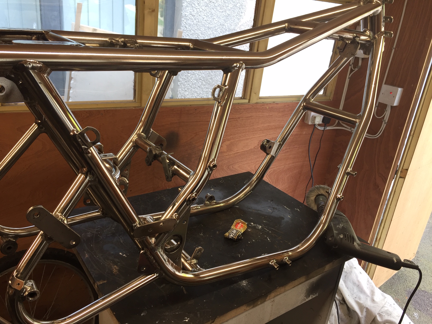 , from Doug Taylor Bristol I’ve got some heat insulating paint for the exhaust inner face to stop blueing, frost sell it , can only go on clean metal so now is time to do it , will it work ? Log header is quite thin, re nickel on swinging arm looks awesome , so if frame doesn’t polish up it will get same treatment, so that would add 2 months to build and another 1k