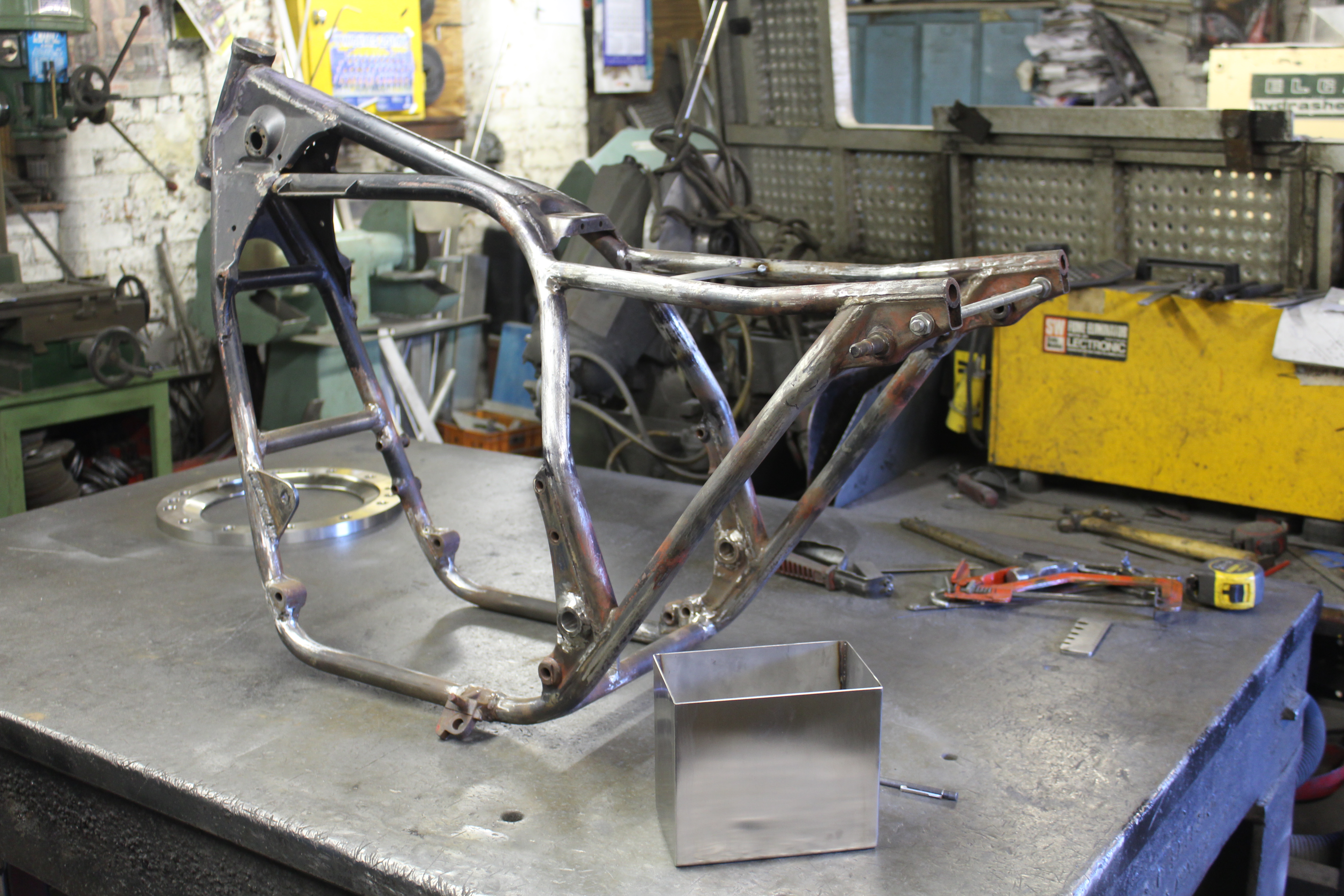 Had a battery box fabricated along with an electrics box to keep it in, both in stainless steel. While the frame was on the workshop table, I asked the welder to clean up the frame welds, a lot happier with the frame now. Though it still needs more cross bracing and the seat area finishing, which will have to wait until I know what seat / tail unit its having. He hadn't cleaned up the welds In the pic below..