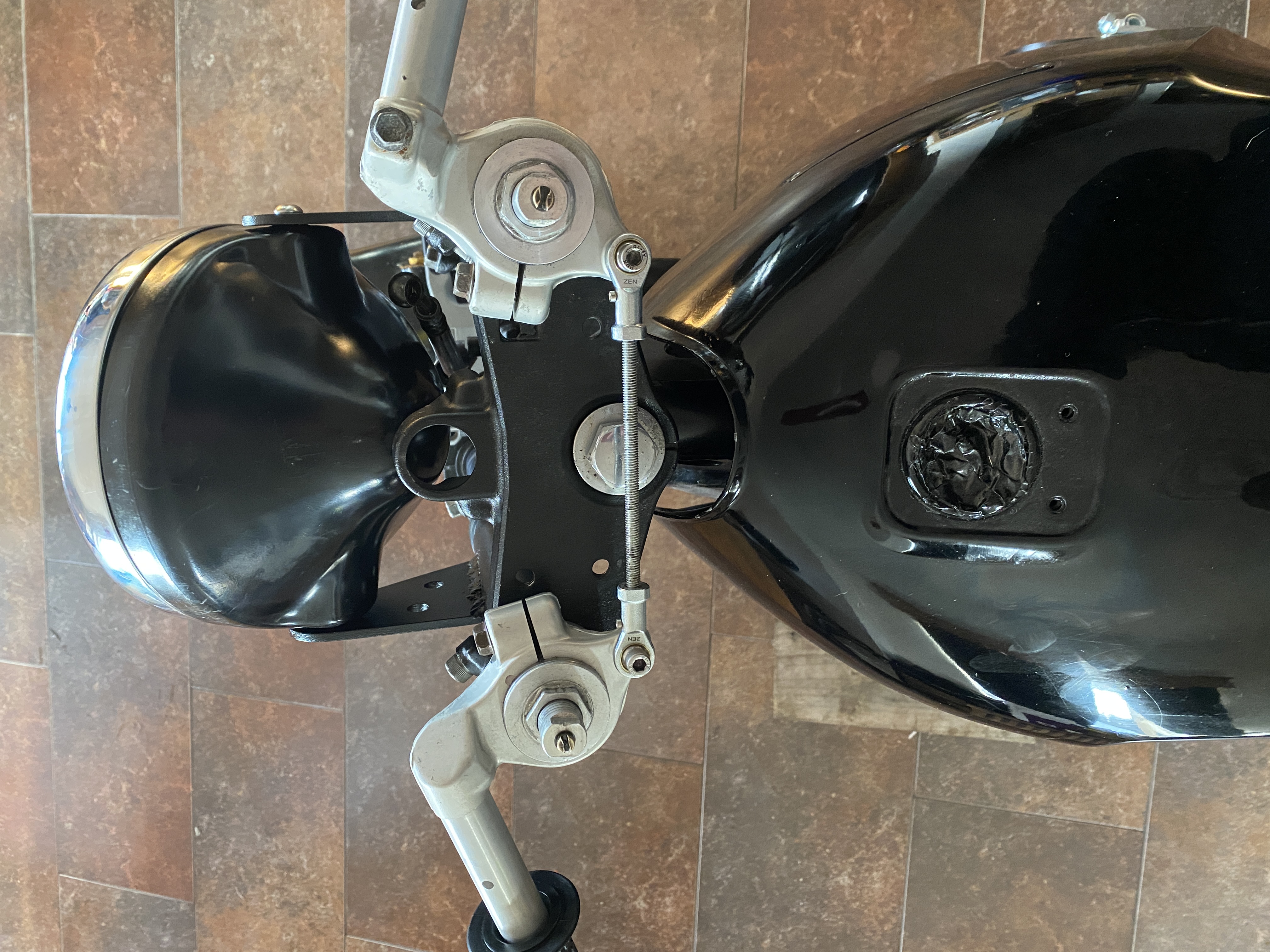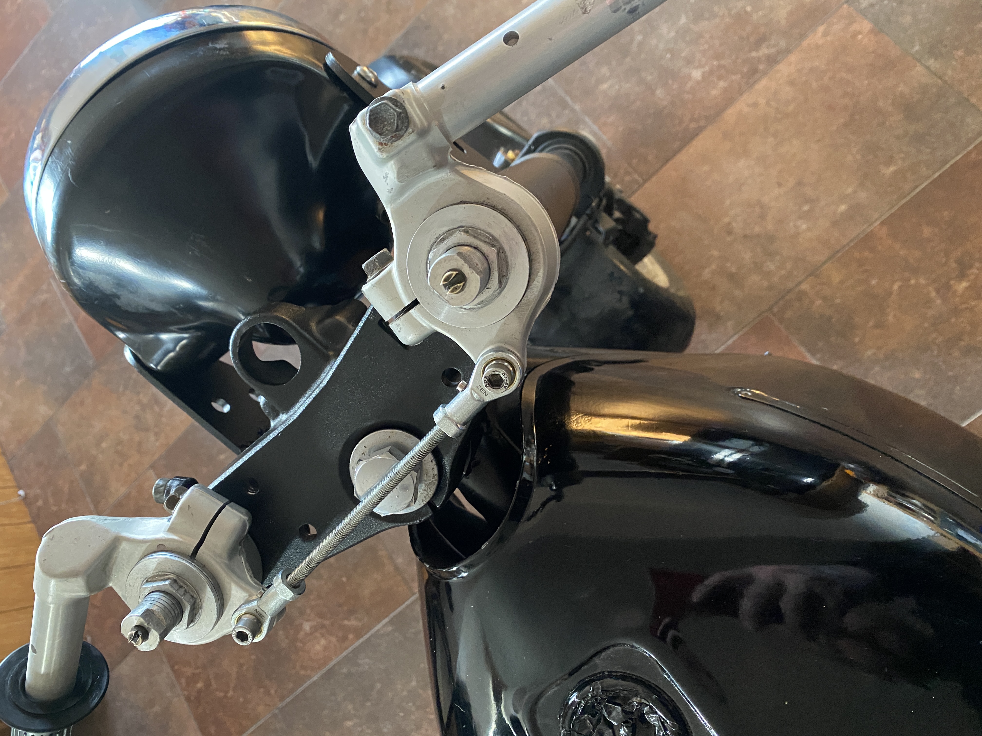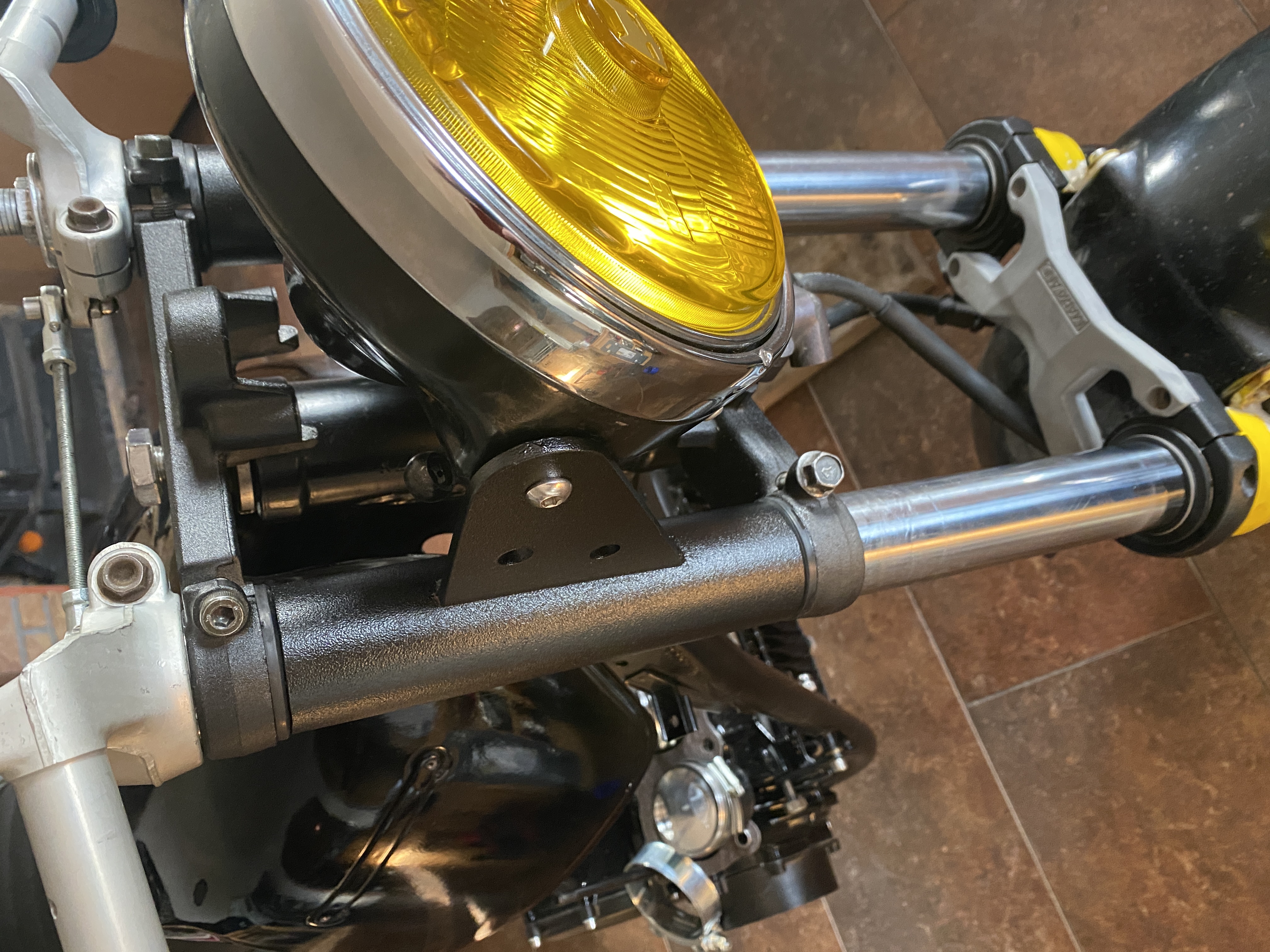 Finished up the headlight bracket with its rubber seats, the fork shroud is 2mm steel tube, clipons will be powder coated black, all finished off with Marchal headlight.