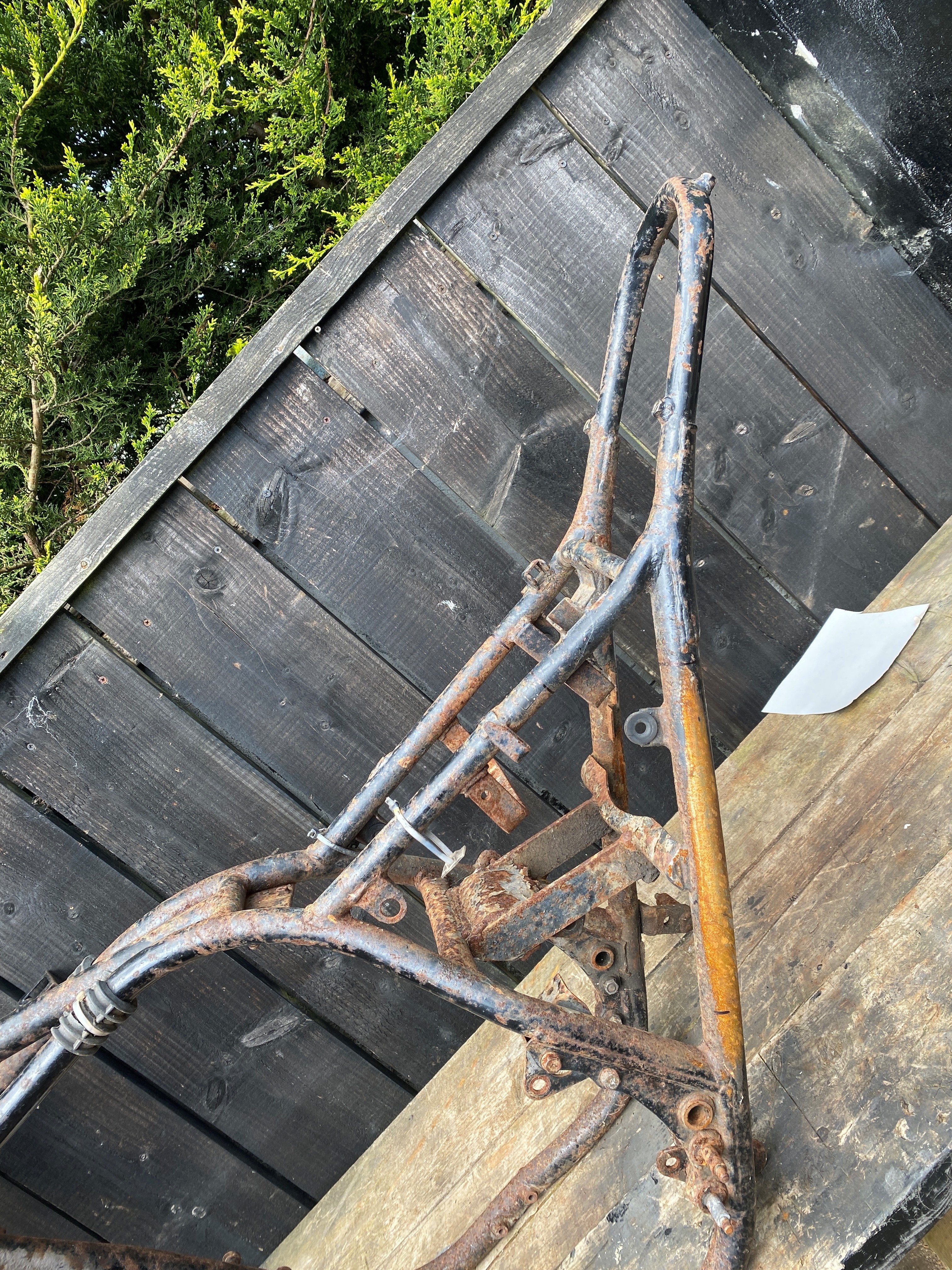 Haven't posted on my Z1000 projects in a while, to many irons in the fire right now, had a free Sunday so i finally got around to saving a frame from the skip. Bought this kz1000 ( Nebraska built) A2 of a fella for small money. Some chap had decided to mono shock it...but just welded everything in his garage to it and cut off just about everything om the sub frame he could. After he failed miserably to make a bike he threw it in a ditch.