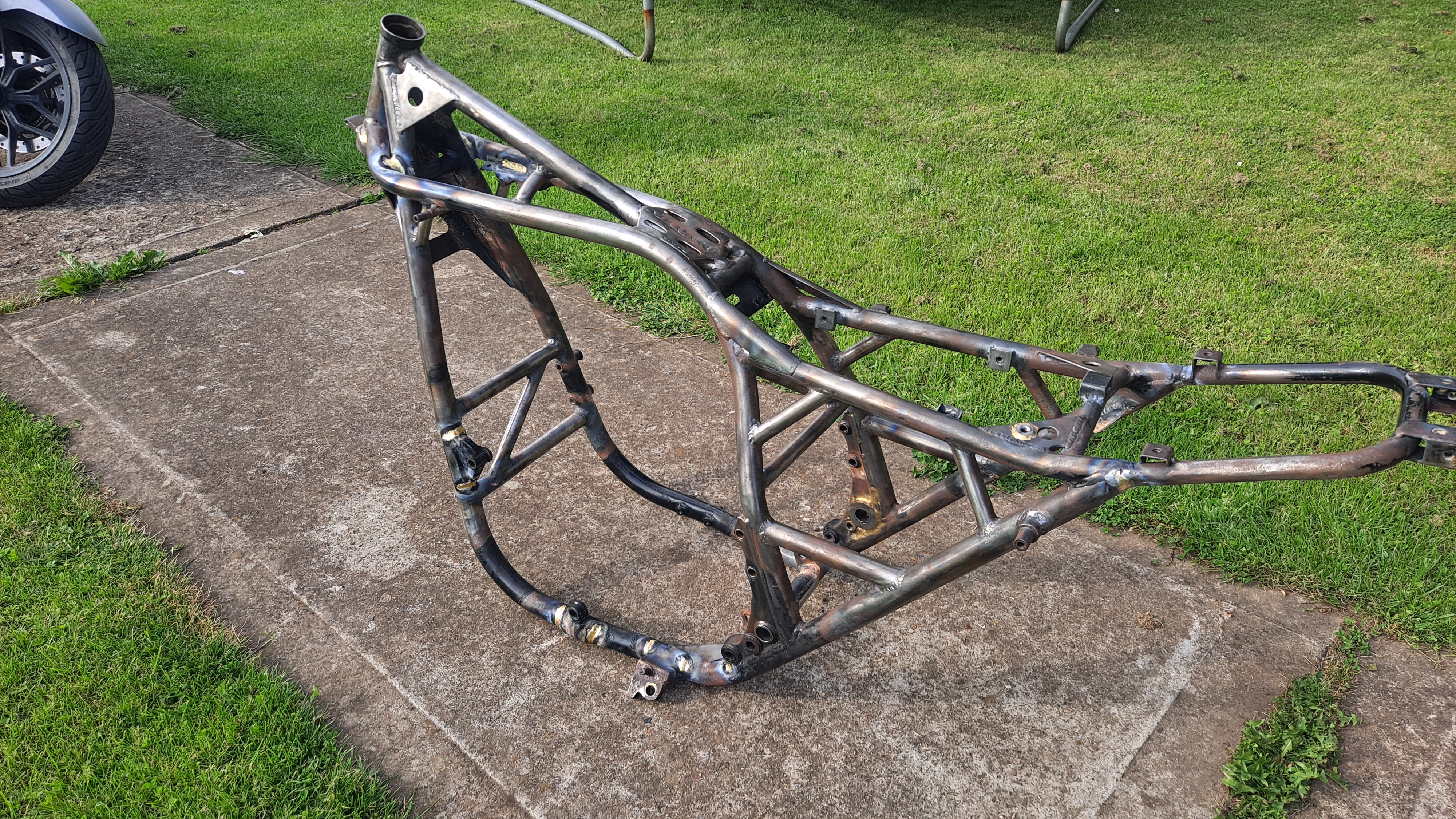 When i dropped them off i was told they are very busy and the job will take 10 to 14 days so not wanting a further delay i got up and out early this morning and pushed to finish the frame, sweating any rust traps with fillets of bronze and gave it a final going over ready for another trip to the coaters in the morning along with the side stand and rear motor mount to be done in Gloss black..