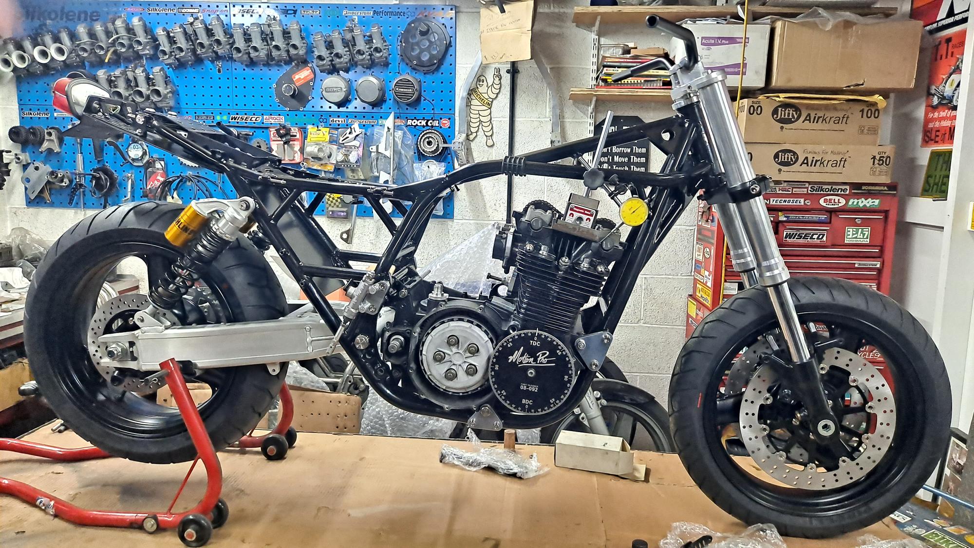 Anodising stripped, sliders polished, forks rebuilt and wheels fitted.