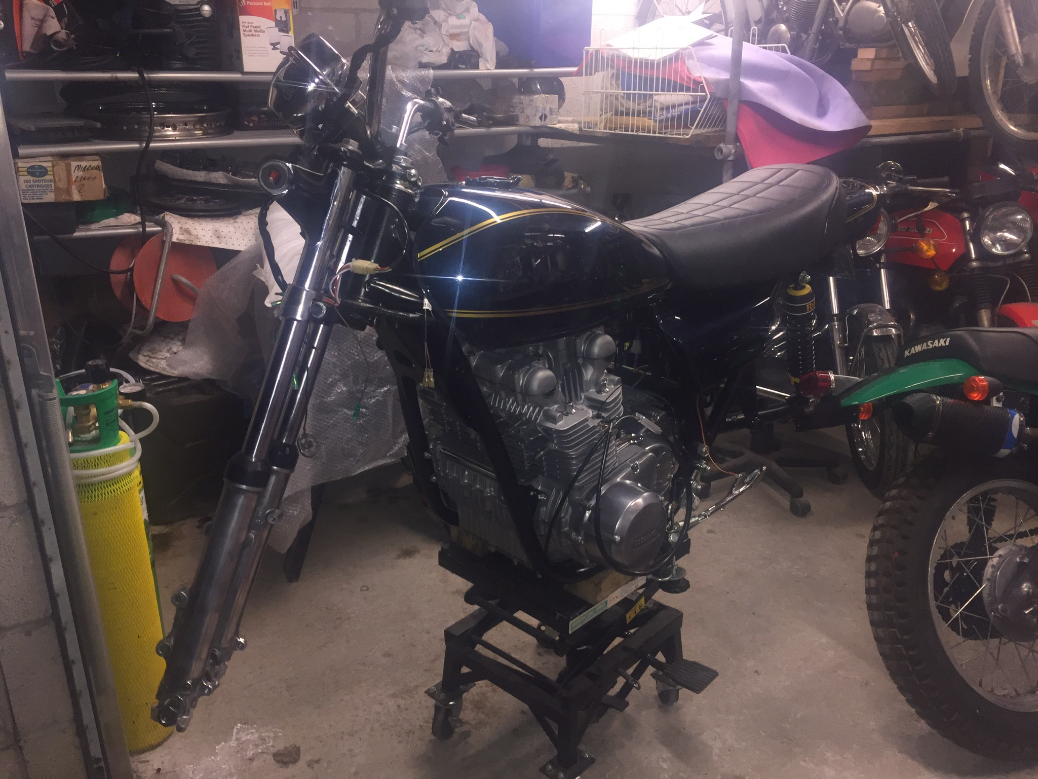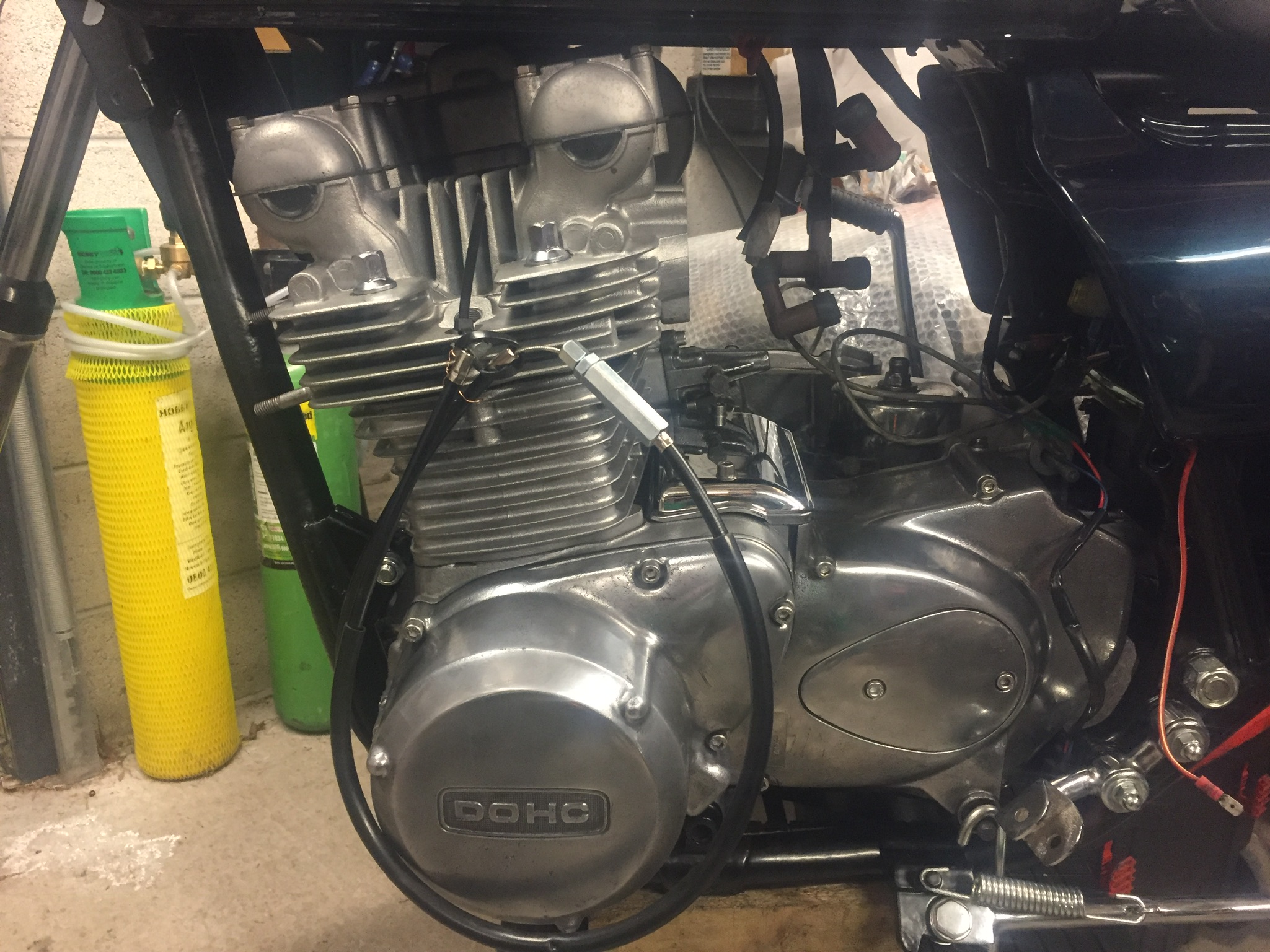 After the Valve stem / spring seat fiasco I had the luxury of an entire day in the garage yesterday and once the head was on it seemed rude not to size up the logistics of fitting the motor in the frame. So with the frame and forks secure on a mobile scissor jack, protected by push bike inner tubes and the motor suspended with 3 x 1" ratchet strapping and scaffold pipes from the rafters all it took was some minor adjustment on the height and angles and boom! In she goes. Now she's beginning to look like a proper bike! I will try and get some pics up because obviously without them it didn't happen. But FWIW you can fit a Z motor solo without dropping a bollock. Bonus is I now have some room in the garage for the CB550 that should be winging it's way to me. Just don't know what to do with the RD250C that fell in my lap on Saturday!!