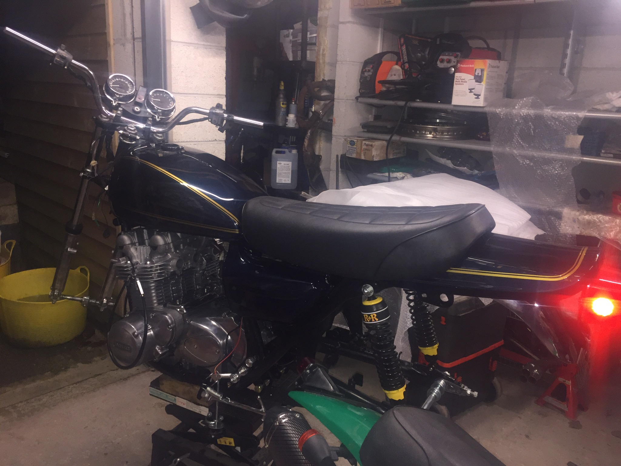 Fit the carbs, air box, tank, panels, seat, grab rail - better get one - wheels, calipers, tyres, centre stand and foot pegs and we are pretty much done. Should only be a month or so :-)