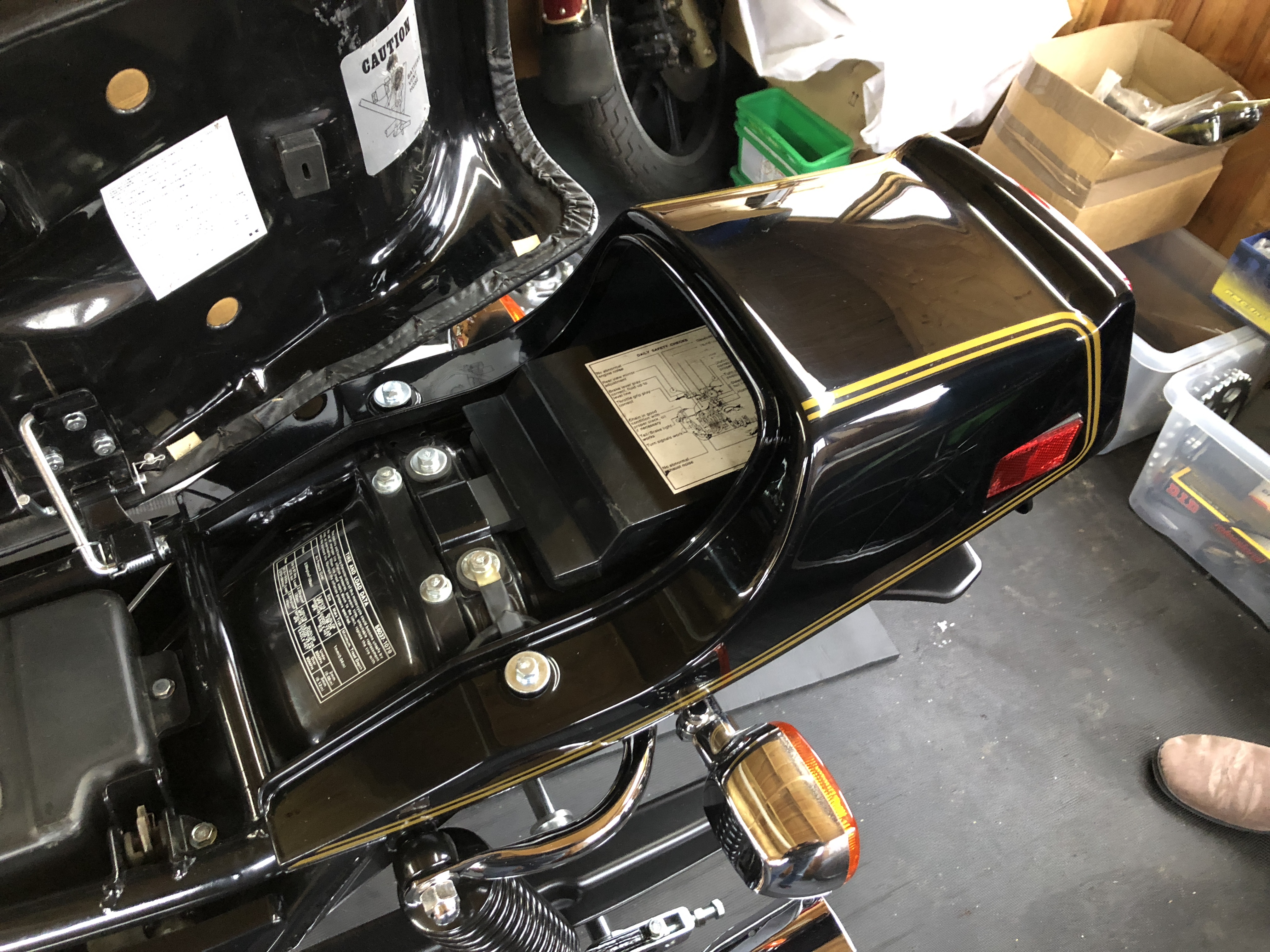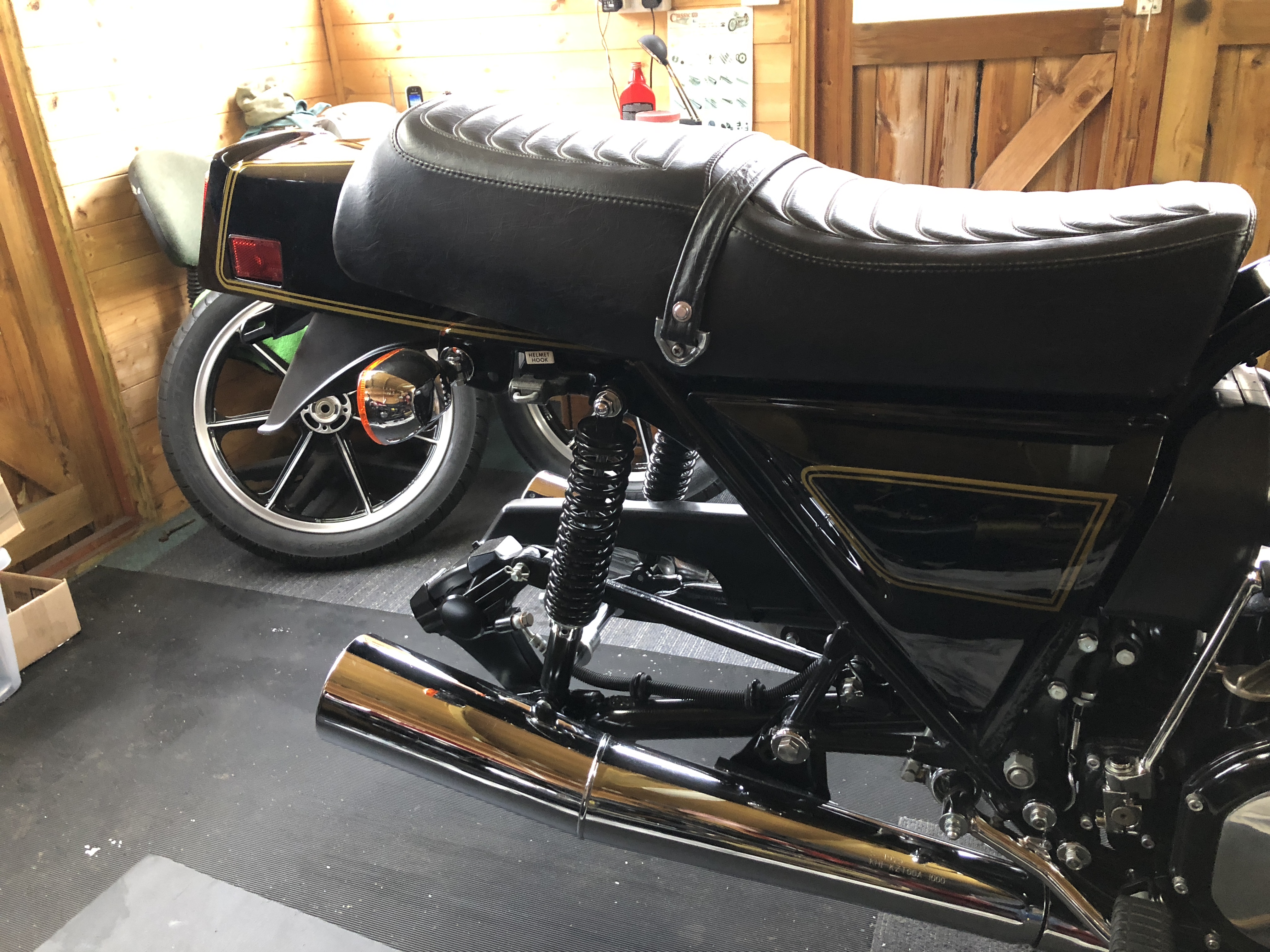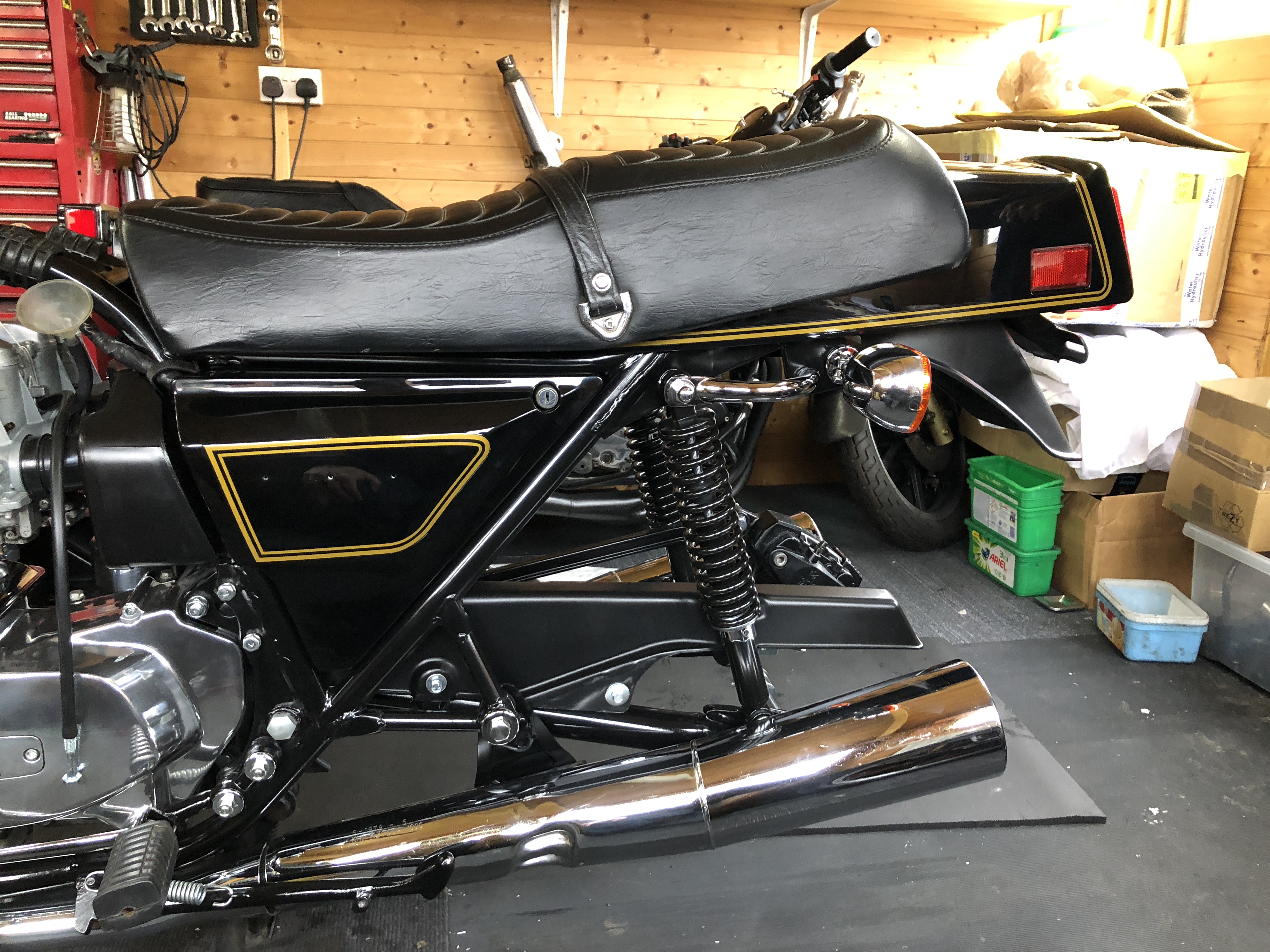Bit more progress now. Carbs fitted, dialed in and she runs superbly. Front fender fitted, tail cowl and side covers fitted. Wheels should go on at the weekend. Then should be MOT ready towards the back end of next week (weather permitting).