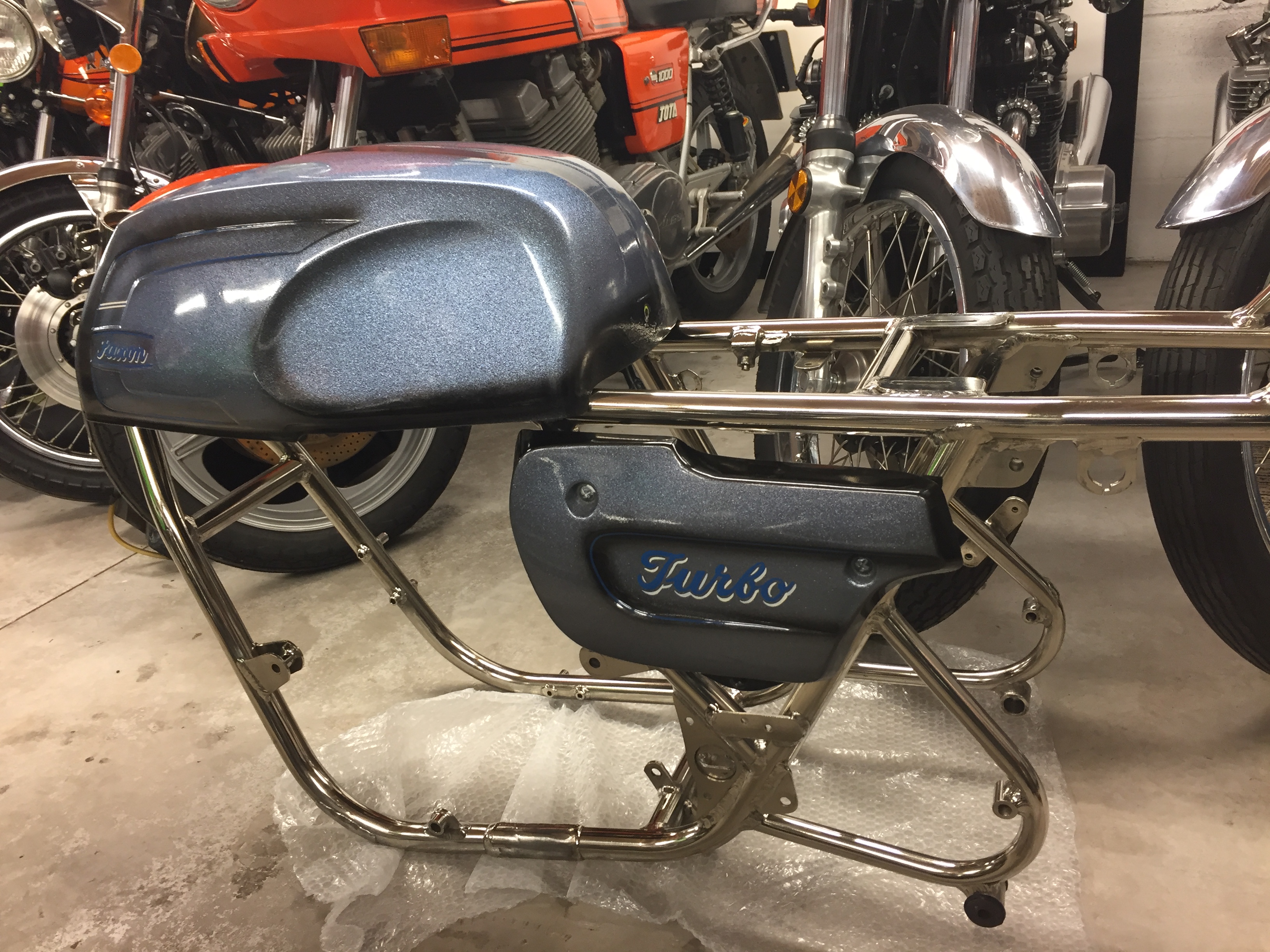 Put the original paint work on the frame just to see contrast with polished work , the frame certainly brings it back to life , can’t change the paint as it’s probably the only original Saxon paint job left , complete with hand pinstripes and lettering,and it’s real 70s glitter flake