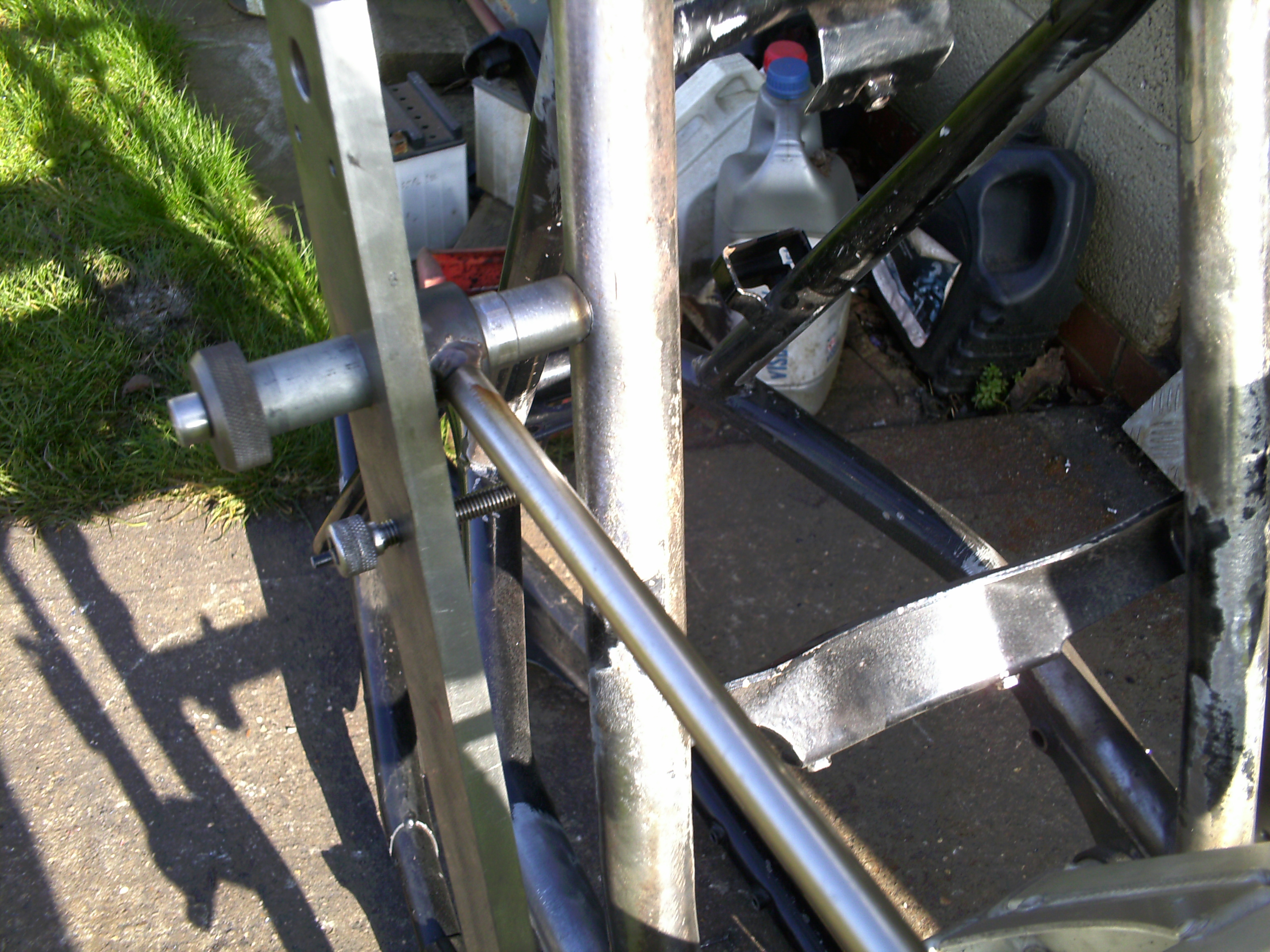 The whole lot bolts to the frame pivot and swingarm with suitable spacers at the pivot to match the width of the swingarm shock mounts and triangulates the position for drilling the frame.