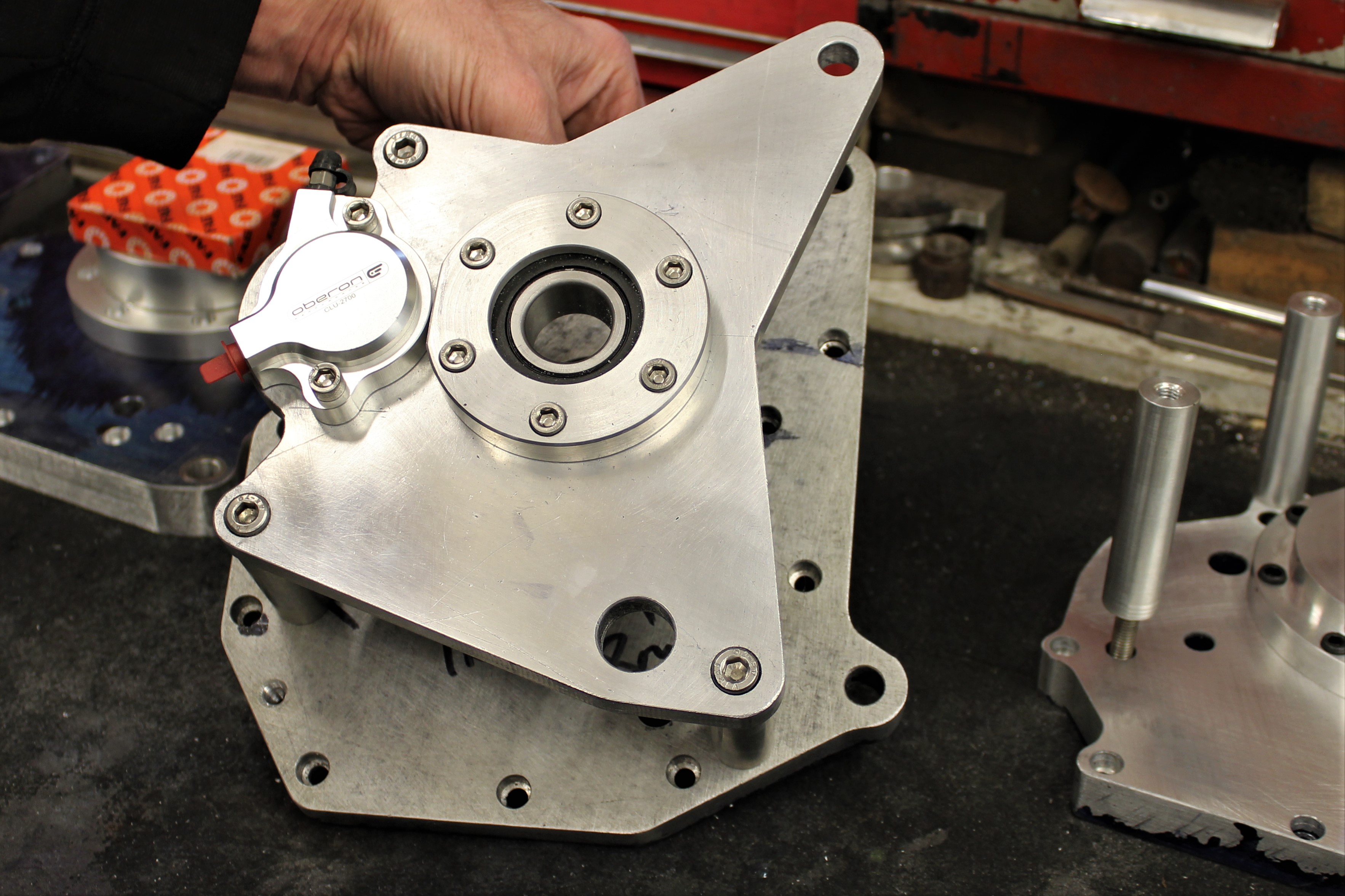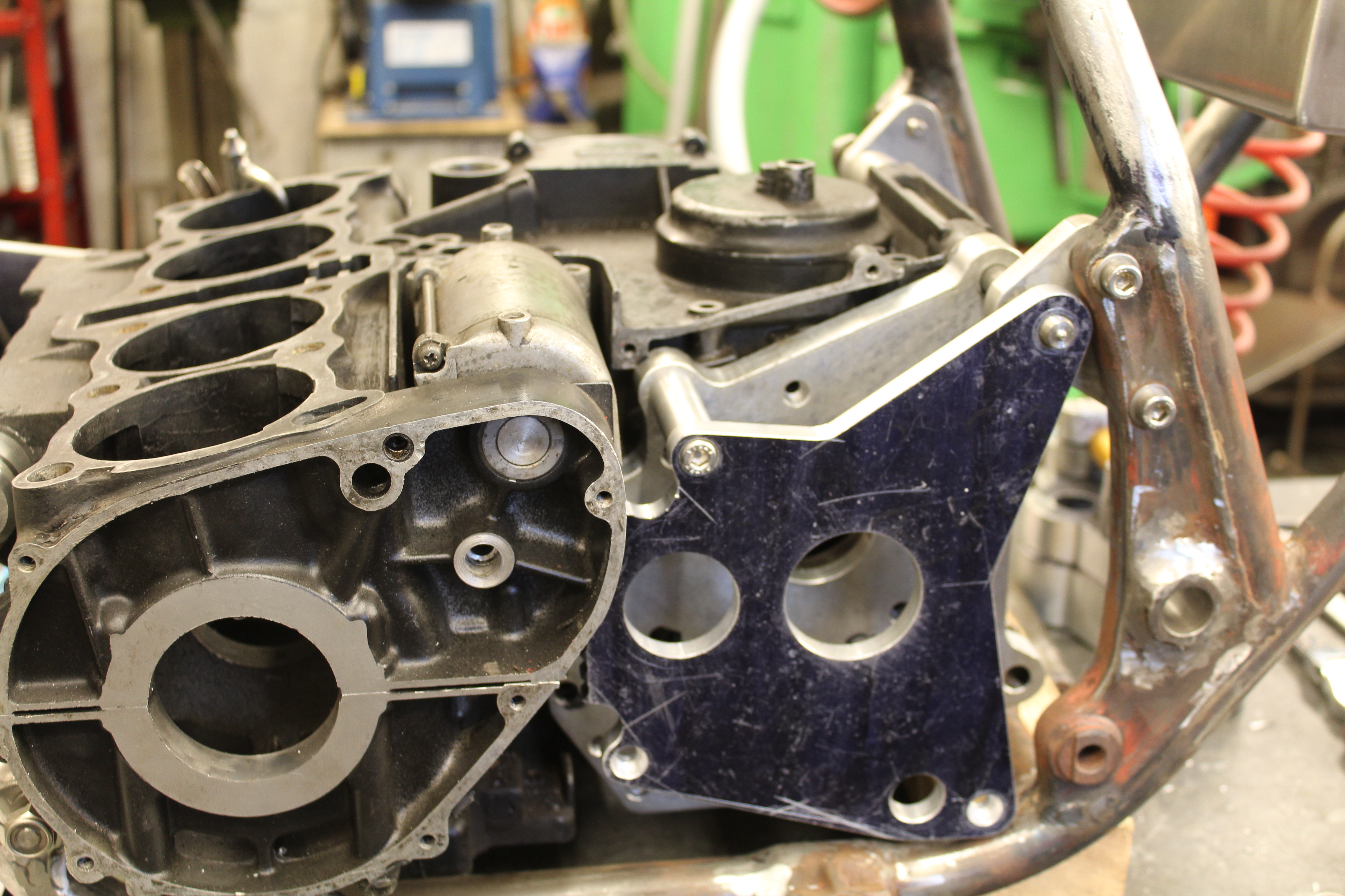 The outrigger support bearing set up is almost done now, just need to get a new gasket so we can machine the inner plate to its final shape. The gearchange shaft normally just passes through the standard alloy cover, which eventually wears, so in this version the gearchange shaft will sit in a roller bearing (not fitted in the pic) as it passes through the outer plate.
