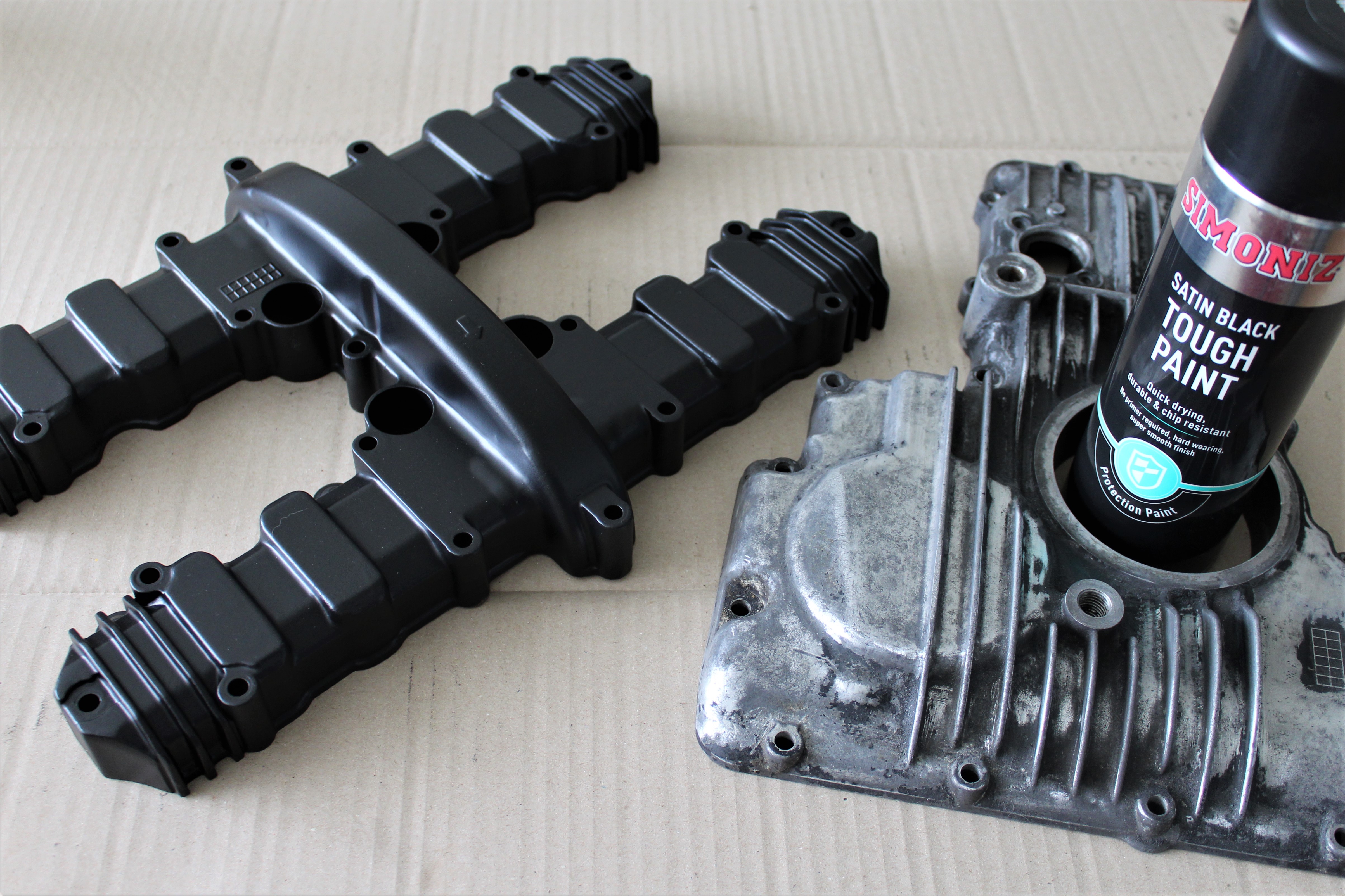 Having read on here that Simoniz Tough paint was recommended, I bought a few cans of satin black (not cheap at £9 each), and made a start on the cam cover and sump. The former didn't need much prep and didn't take long, while the sump needed a lot more work to strip off the old black finish..