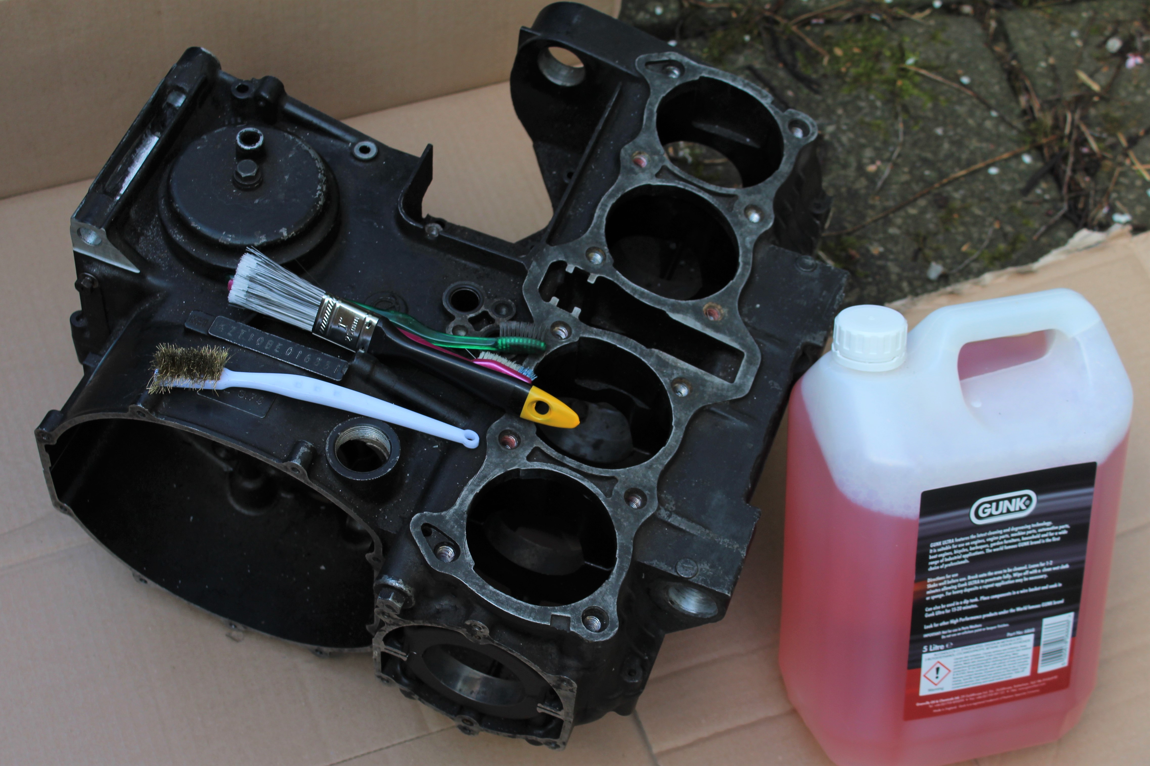 That done, I turned my attention to the engine cases, having bought 5l of Gunk to hopefully make the job a bit easier. I don't know if modern Gunk has changed over the years, but it proved to be pretty useless in removing the old oil and grease from the cases. I found washing up liquid worked better, though after hours scrubbing away with tooth brushes and wire brushes, I had to admit I didn't seem to be getting very far. The problem is that the old oil seems to be hard baked to the surface, and is almost impossible to remove, particularly in between the cooling fins.