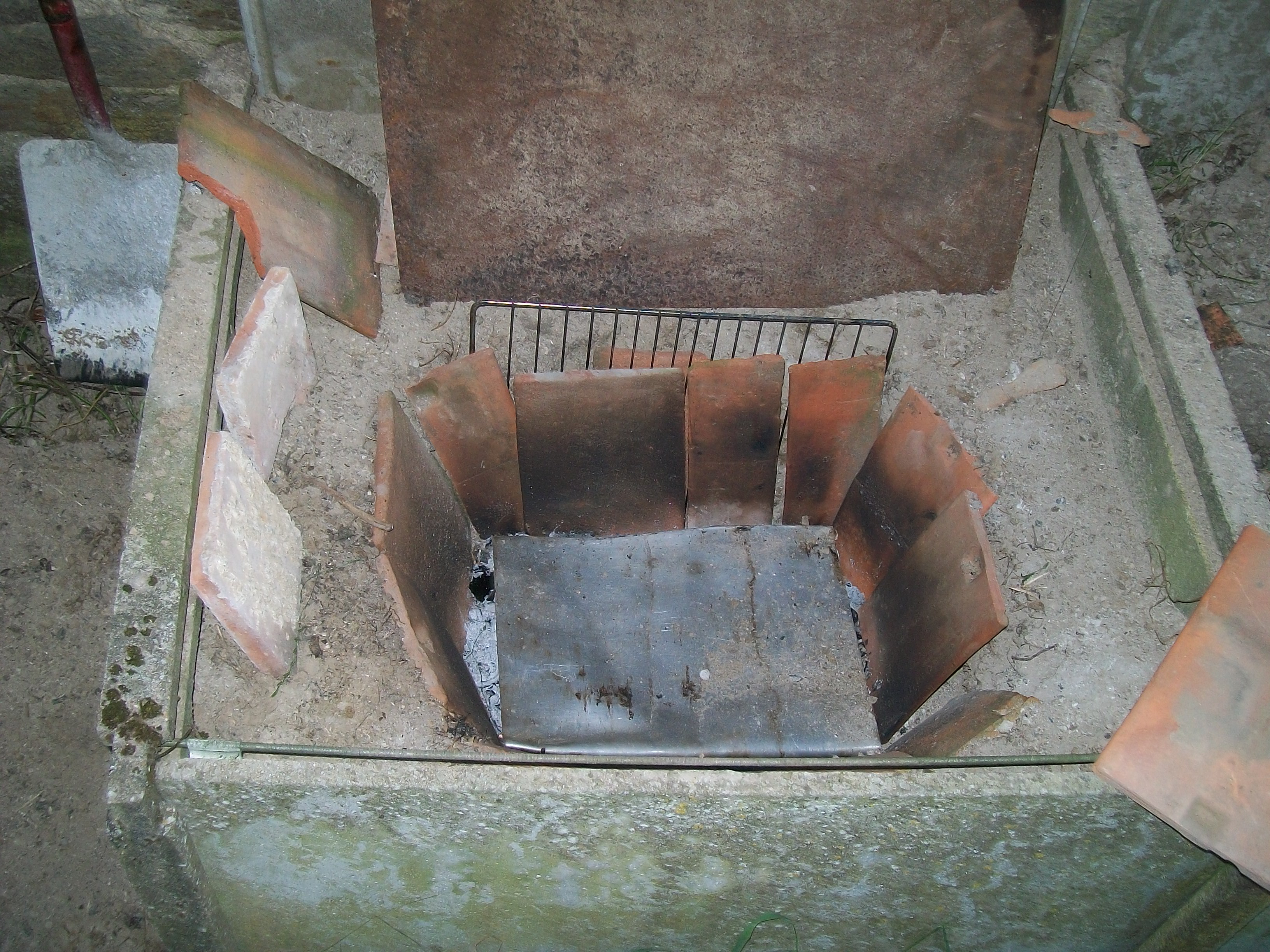 The embers are under the tin sheet with small roof tiles and 1/2 inch floor tiles for insulation all in a rabbit hutch turned on it's side (not a hutch for kids to look at them in....). It didn't get it hot enough to get last liner out but it was hot enough to get it back in and now it fits in the oven again. Back in the oven at 200, sorted.
