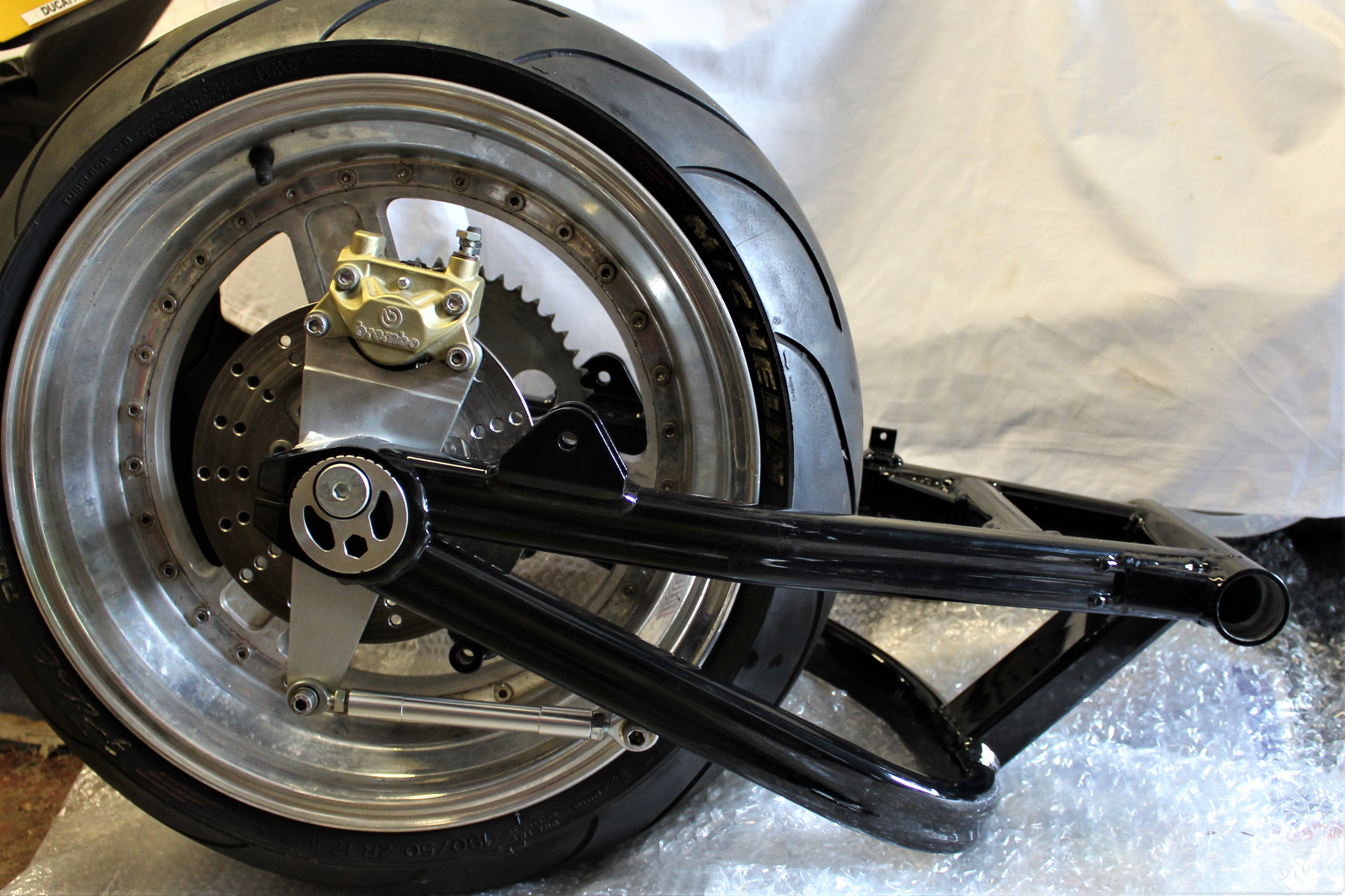 Got the swing arm back from Triple S, so couldn't resist mocking up the back end. Have to be careful not to scratch the inside of the arm, as it doesn't have any wheel spacers yet. Now need to decide what colour to paint the 'spokes'.. probably satin black or gold, not sure yet..