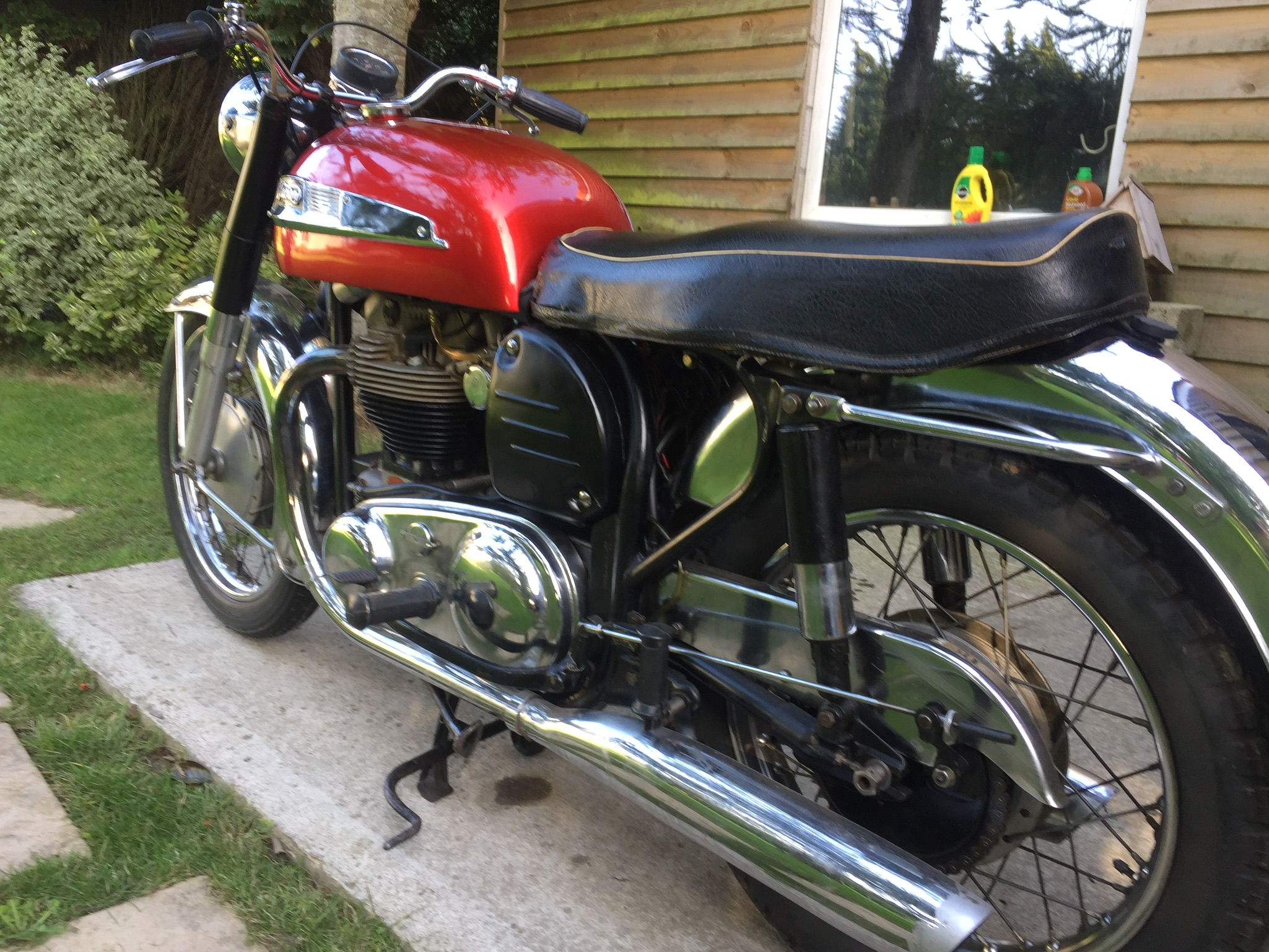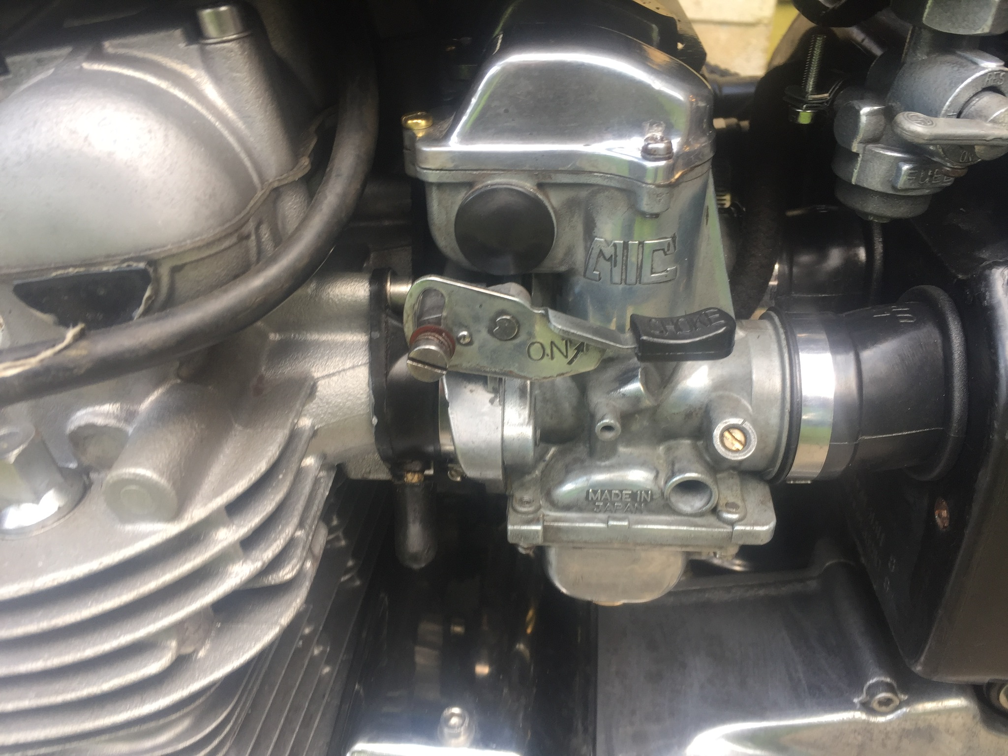 Full day today - fitted the carbs, airbox and silencer - sorted the exhaust and de-seized the seat catch although the lock barrel itself is toast. Re-bleed the front brakes and actually had a little ride up the lane. Surprised how small the bike feels. Possibly the shocks might be a little short. She starts easily and runs sweet apart from the smoking left bank which is coming from number two cylinder. Pretty sure that I messed up on a valve stem seal as all the bores were really nice and number 2 cylinder gave me 150 psi on a comp test.