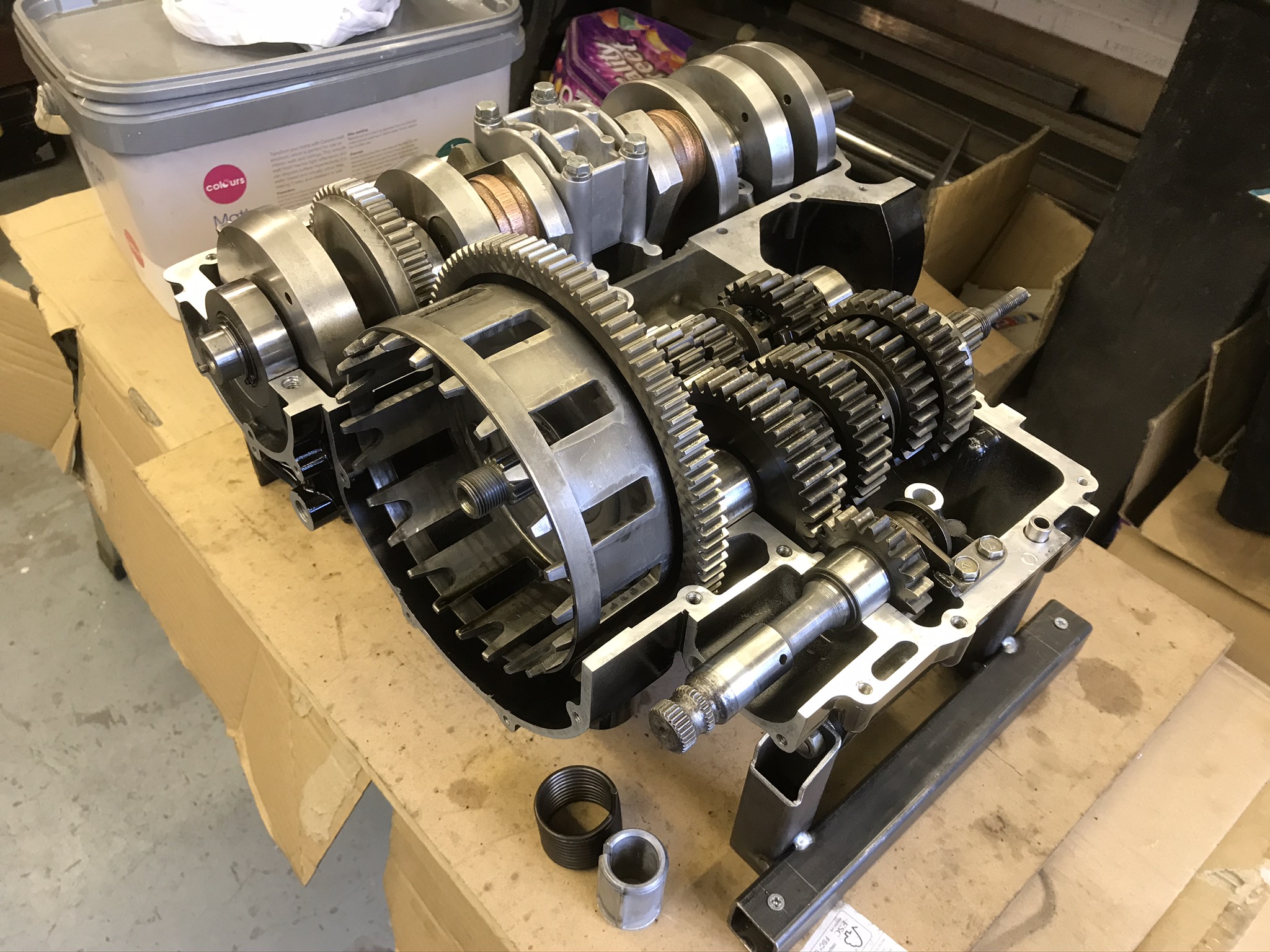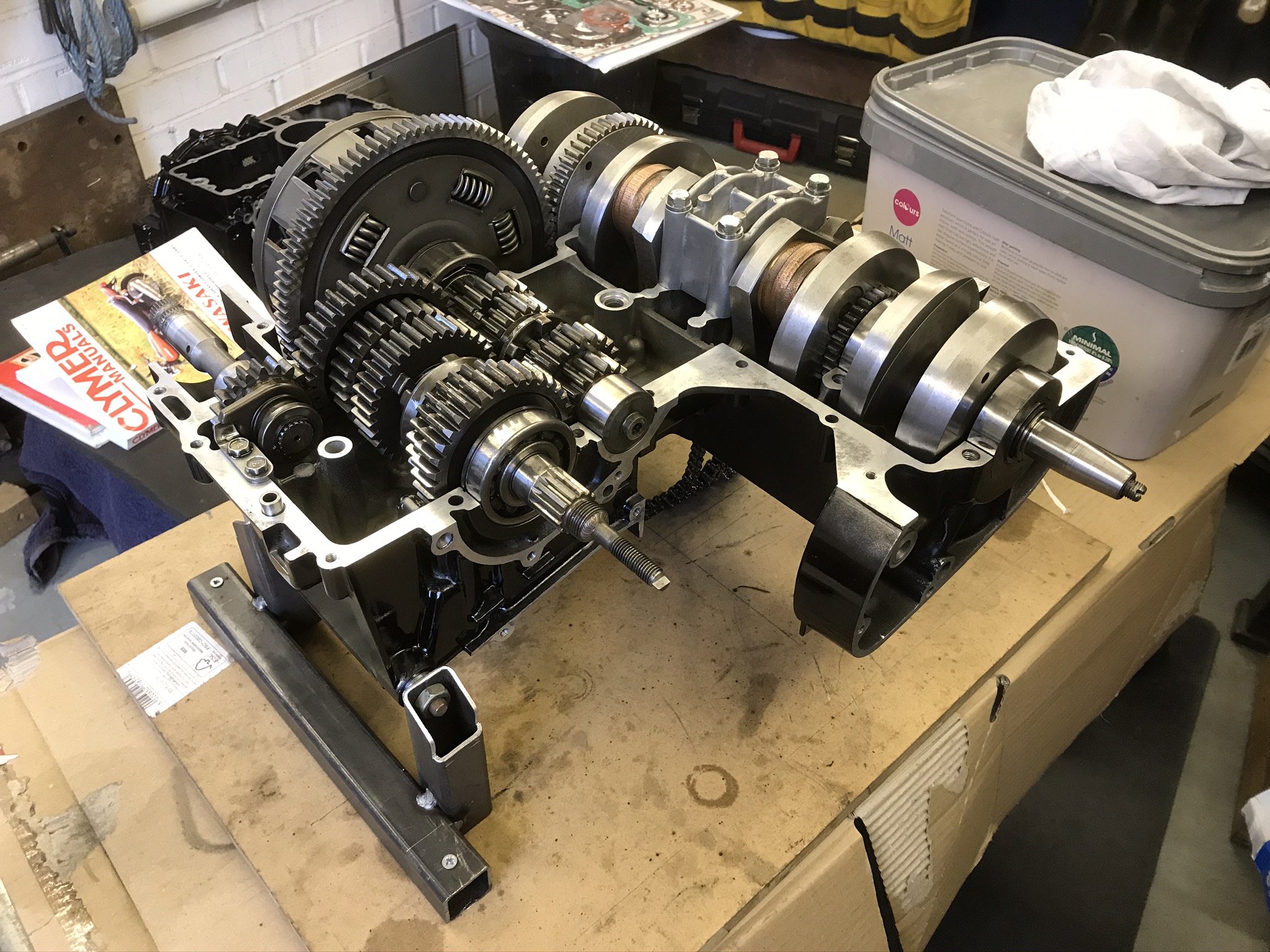 I knocked up a little engine jig to build it in. Top case with crank, gearbox and clutch in.