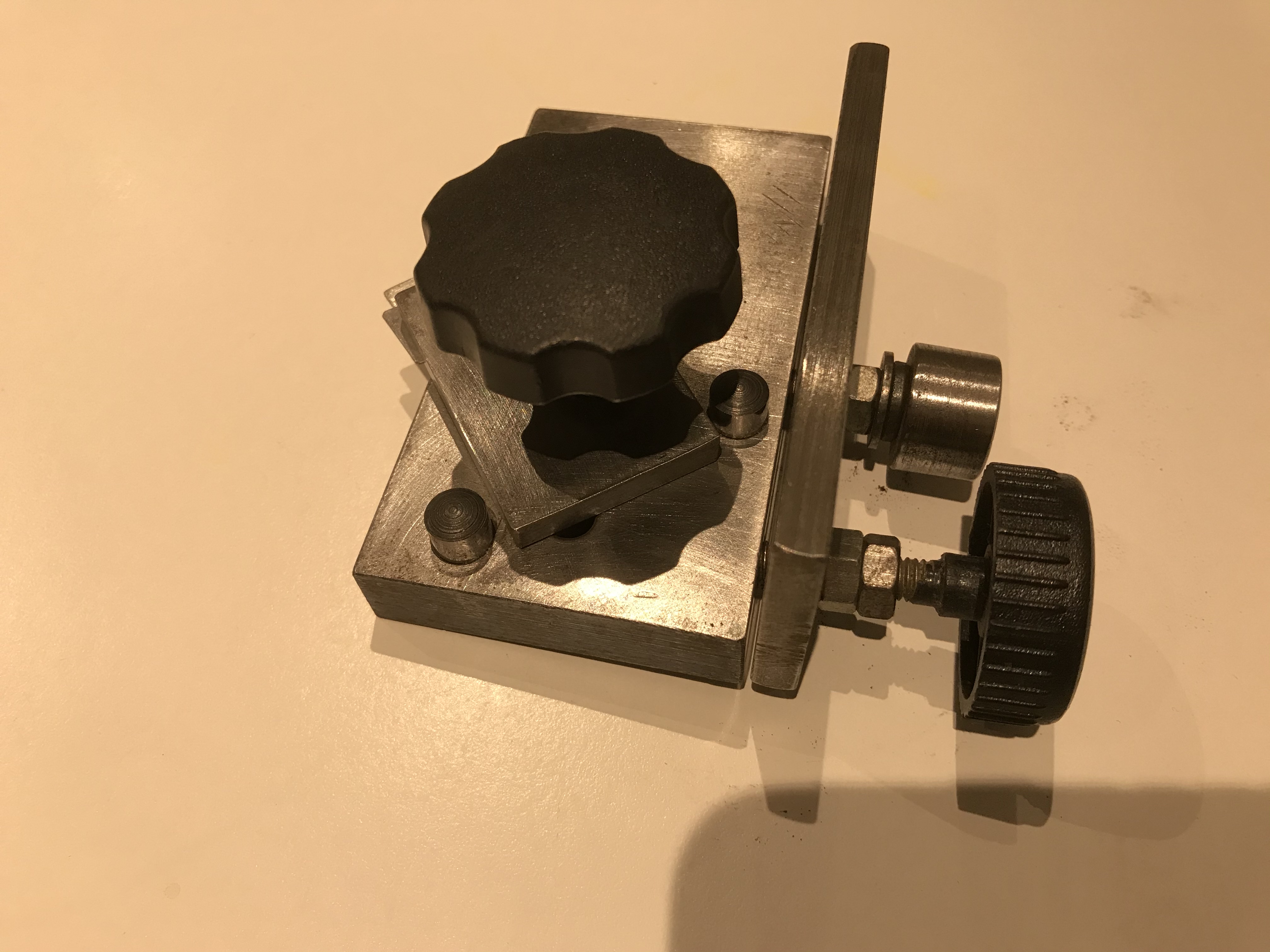 So I drop a ring into a bore and measure the gap with a feeler gauge as you do, to find the gap’s too small. “Phew!!! It’s a good job I didn’t go ahead and just build it” me thinks. But how am I going to file the ends of the rings accurately keeping them square? Do I buy a machine to do it? No, I make a jig. I used a GFS (tool steel Ground Flat Stock) plate as a base and bored two dowel holes at calculated positions so that the ring could locate against the dowels and the intersection of the edge of the plate is square to the edge of the piston ring, i.e. the centre of the ring lies on the edge of the plate. This edge of the plate is the datum edge. I drilled and tapped two holes in the datum edge to fix another piece of GFS to act as a stop. This is the fence. I drilled and tapped another hole in between the dowel holes for a clamp to hold the ring in place.
