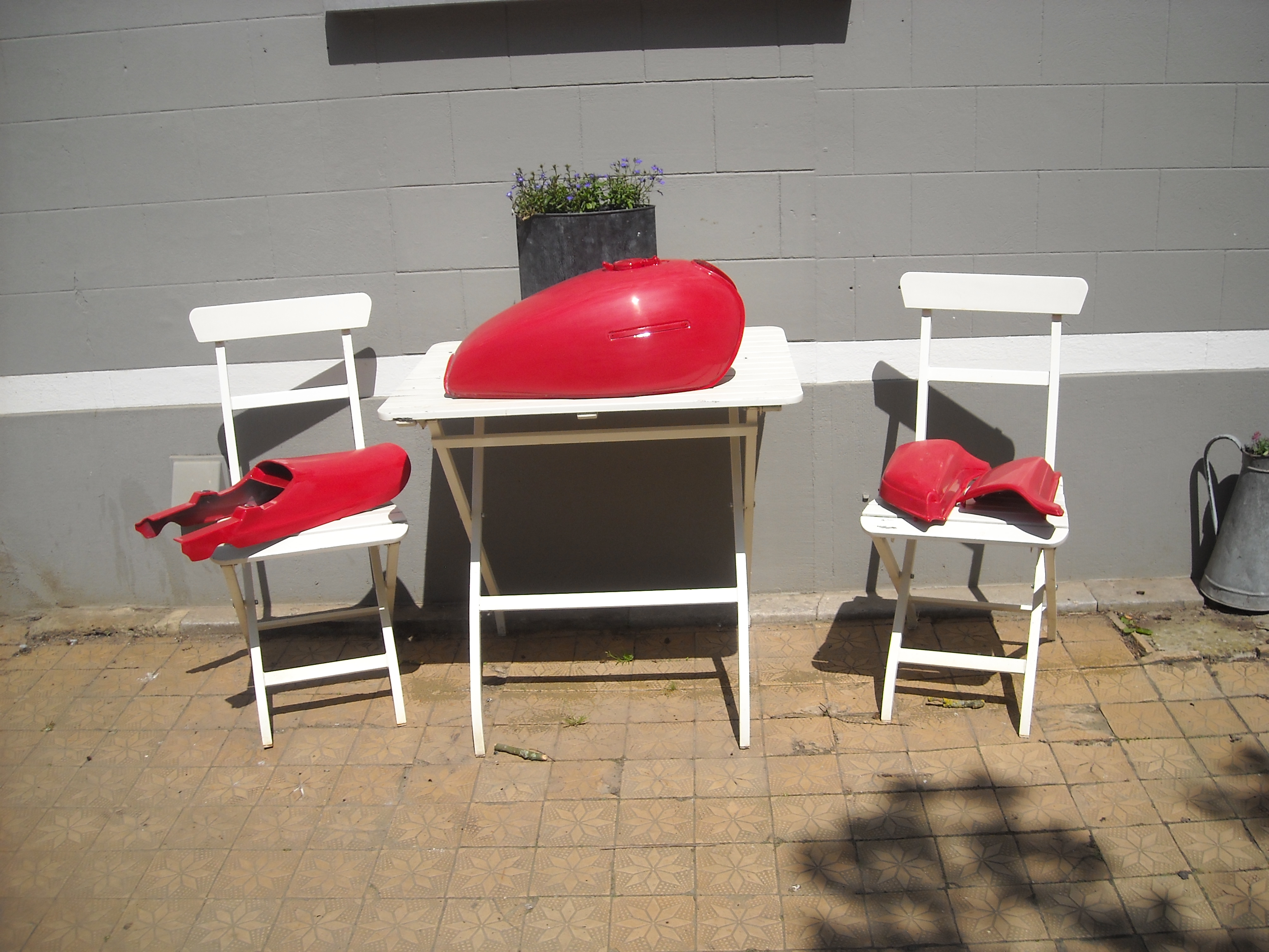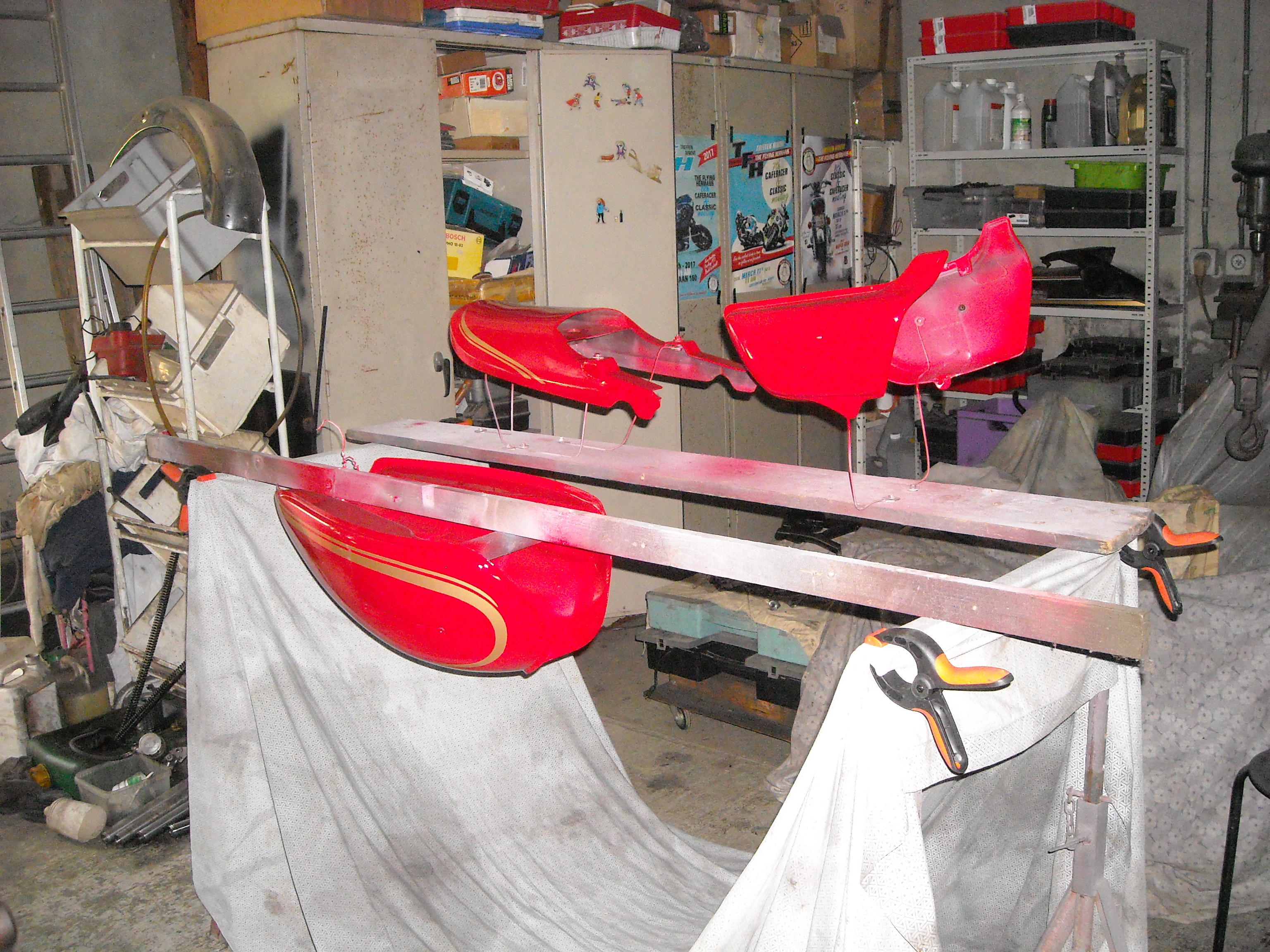 Now I'm waiting for the paint to arrive. The body work will receive a red paint coat with the golden curved stripes as original.
