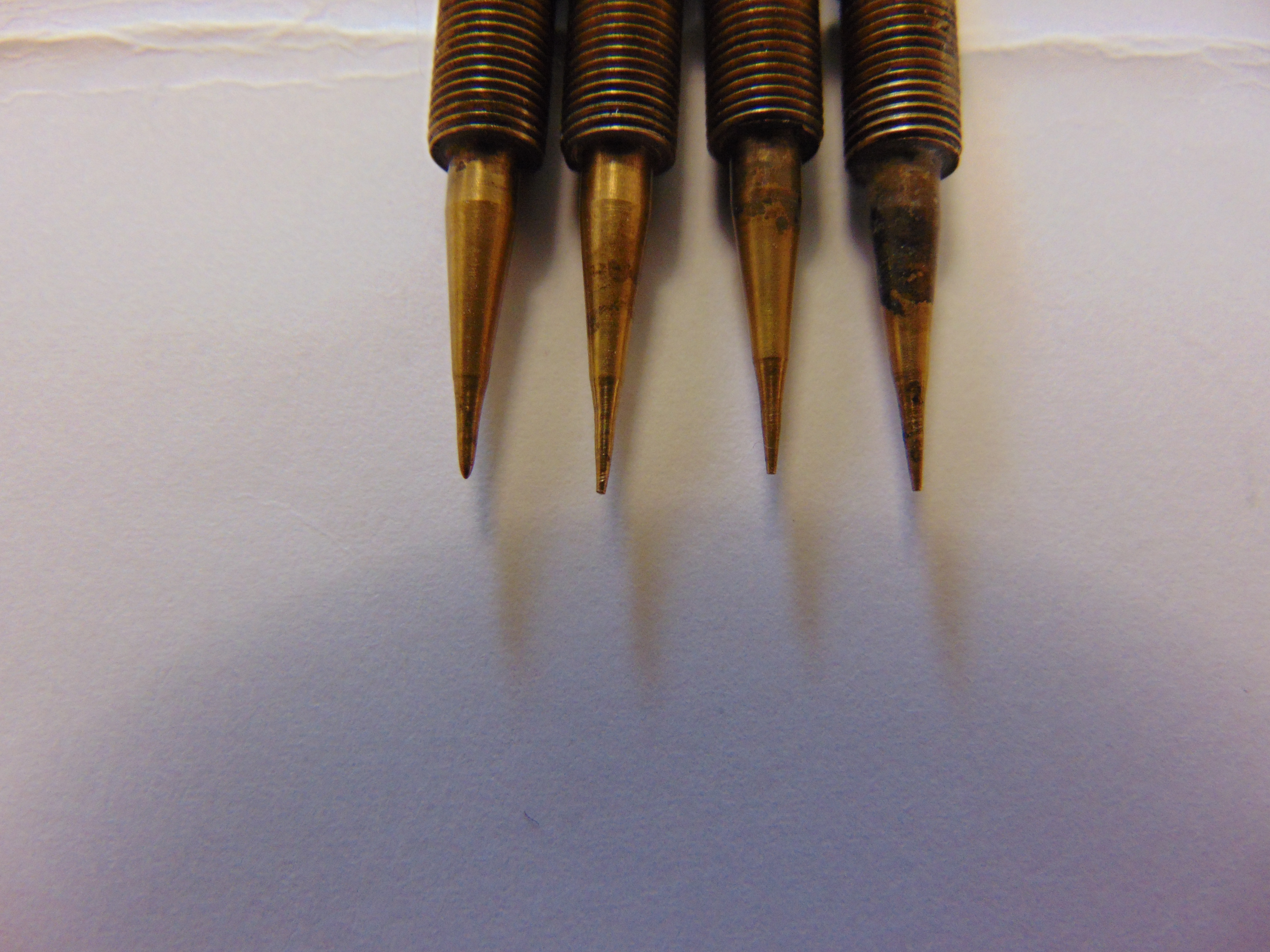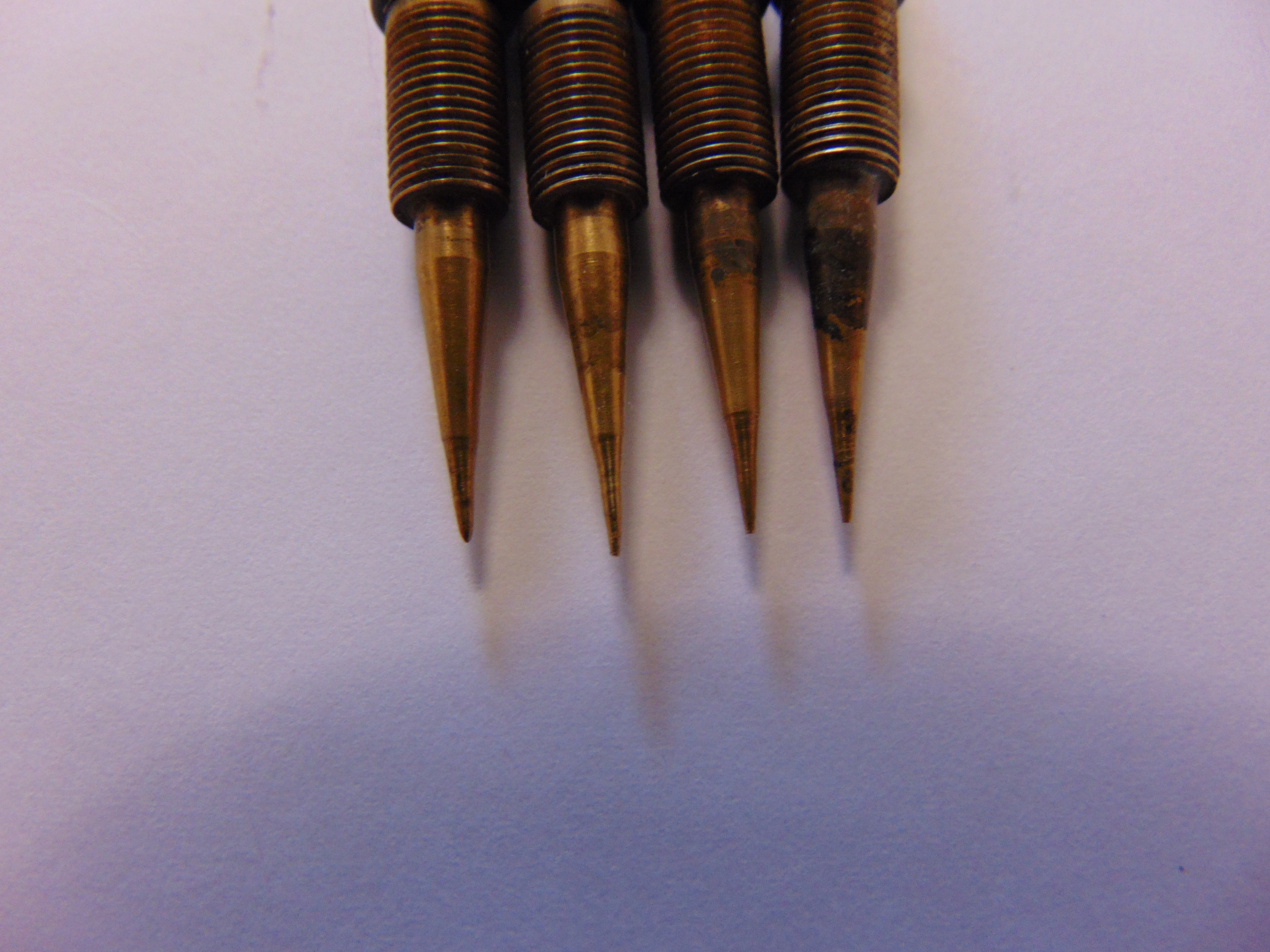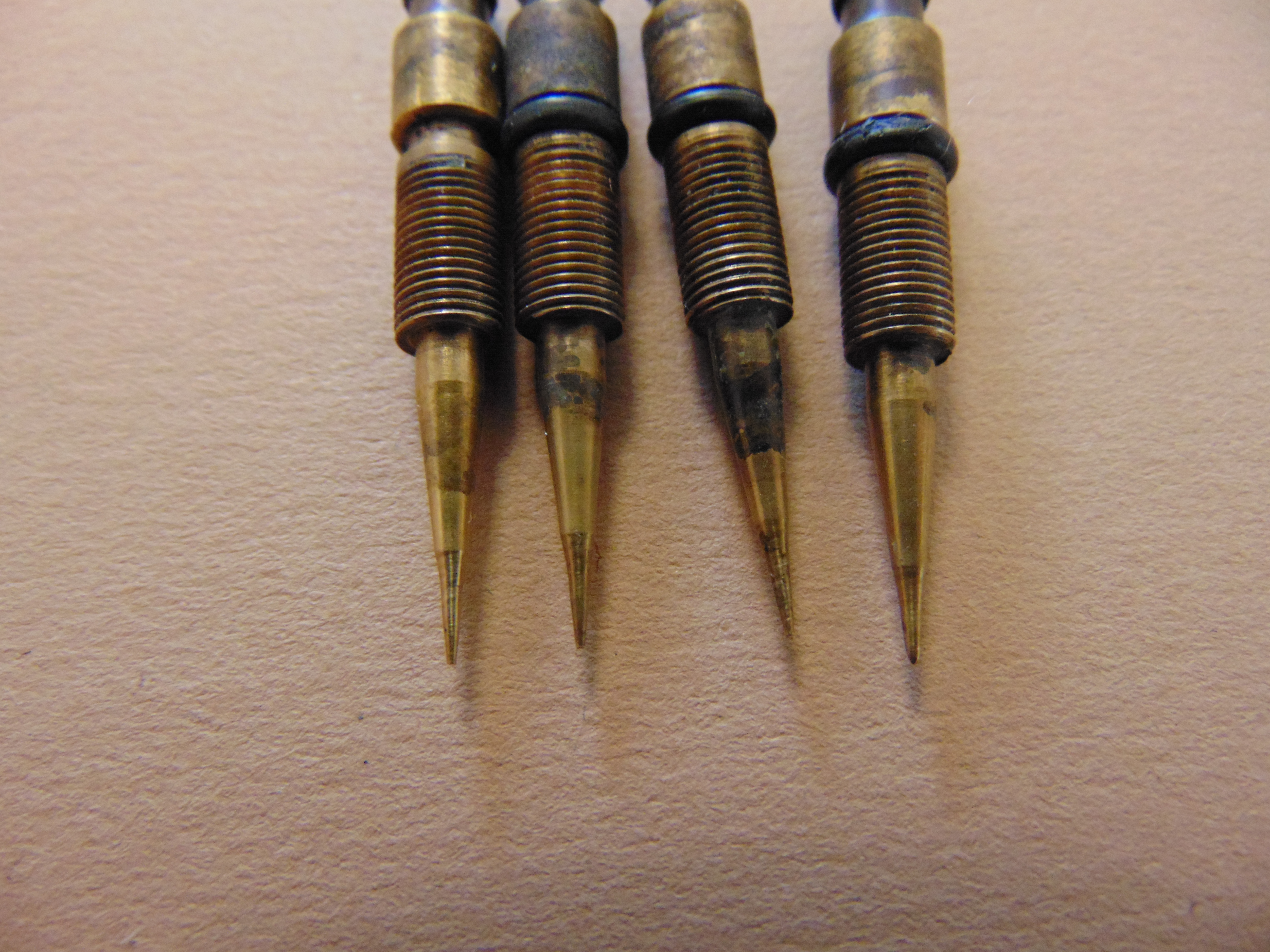 After getting another thou in April, and suffering some disappointment thanks to P.O, like badly abused head and carbs, i decided to source replacements, so a big thank you to Gary D who supplied a motor in bits but with the head re-furbed by buzzard, just needed putting together and a small weld to an exhaust stud hole which i had done locally £20, numerous shim swaps thanks to Jerry, carbs were stripped and soaked and treated rebuild kits, these are the pilot screws and had been somewhat over tightened, you can see the shoulders on them, they protruded into the carb throats about 1.5mm, so new ones set at 2 turns out. I also have another set of carbs thanks to Jay1969 if i need them.