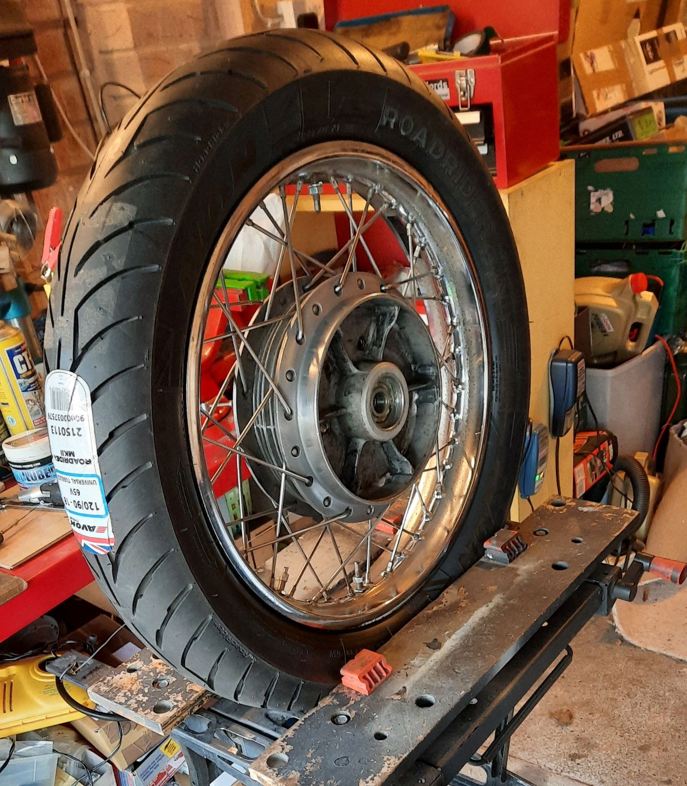 The engine was largely completed last winter, the remainder of the jobs to do in spring where to replace front and rear wheel bearings, repaint front hub in correct colour and change both tyres for Avons. As usual things never go to plan! I had a problem with one damaged front spoke when removing it so ended up replacing all the front spokes. I also found a minor leak on the front brake which meant having to replace the brake piston which had a small pit just where the seal was sitting.